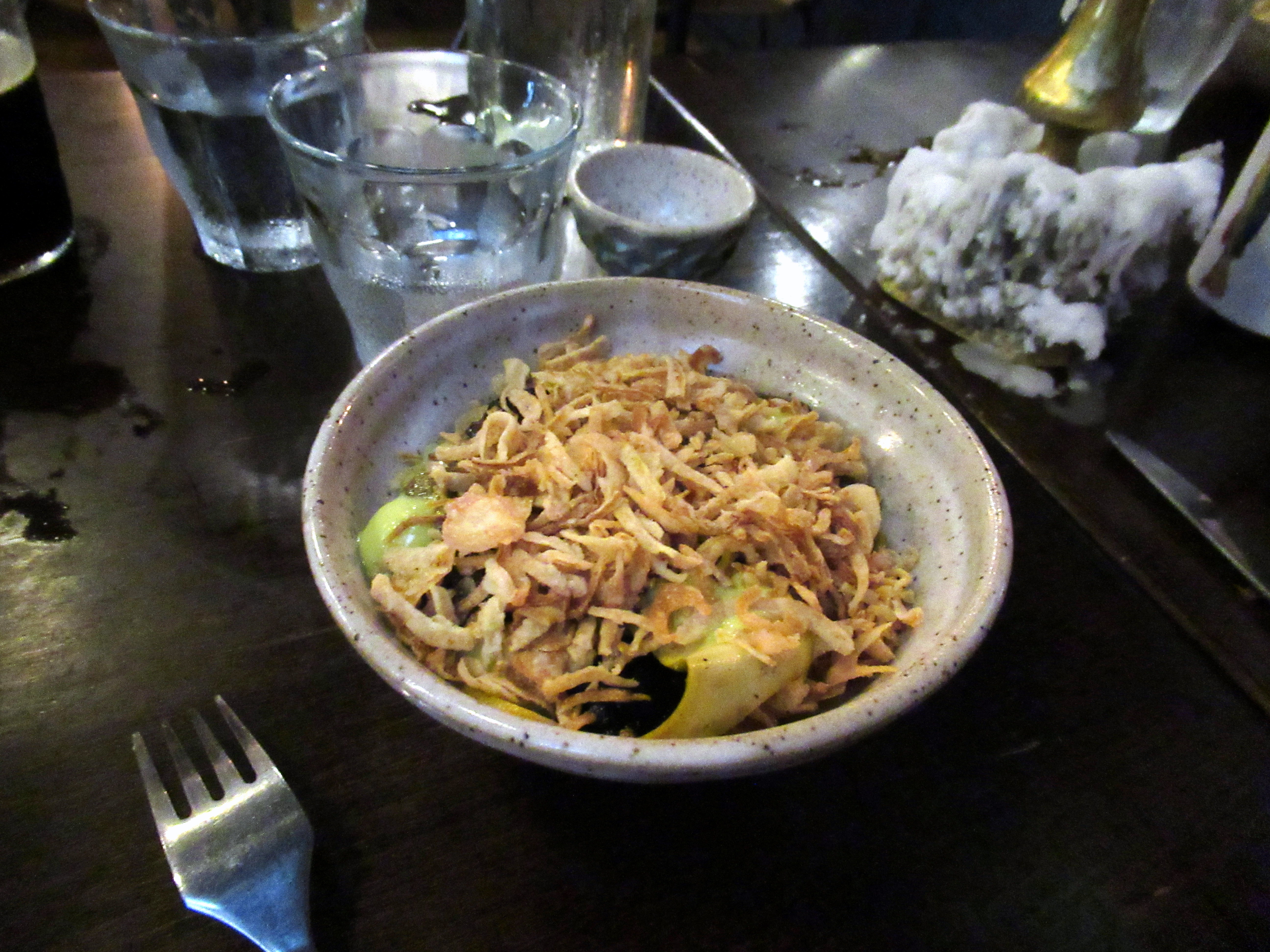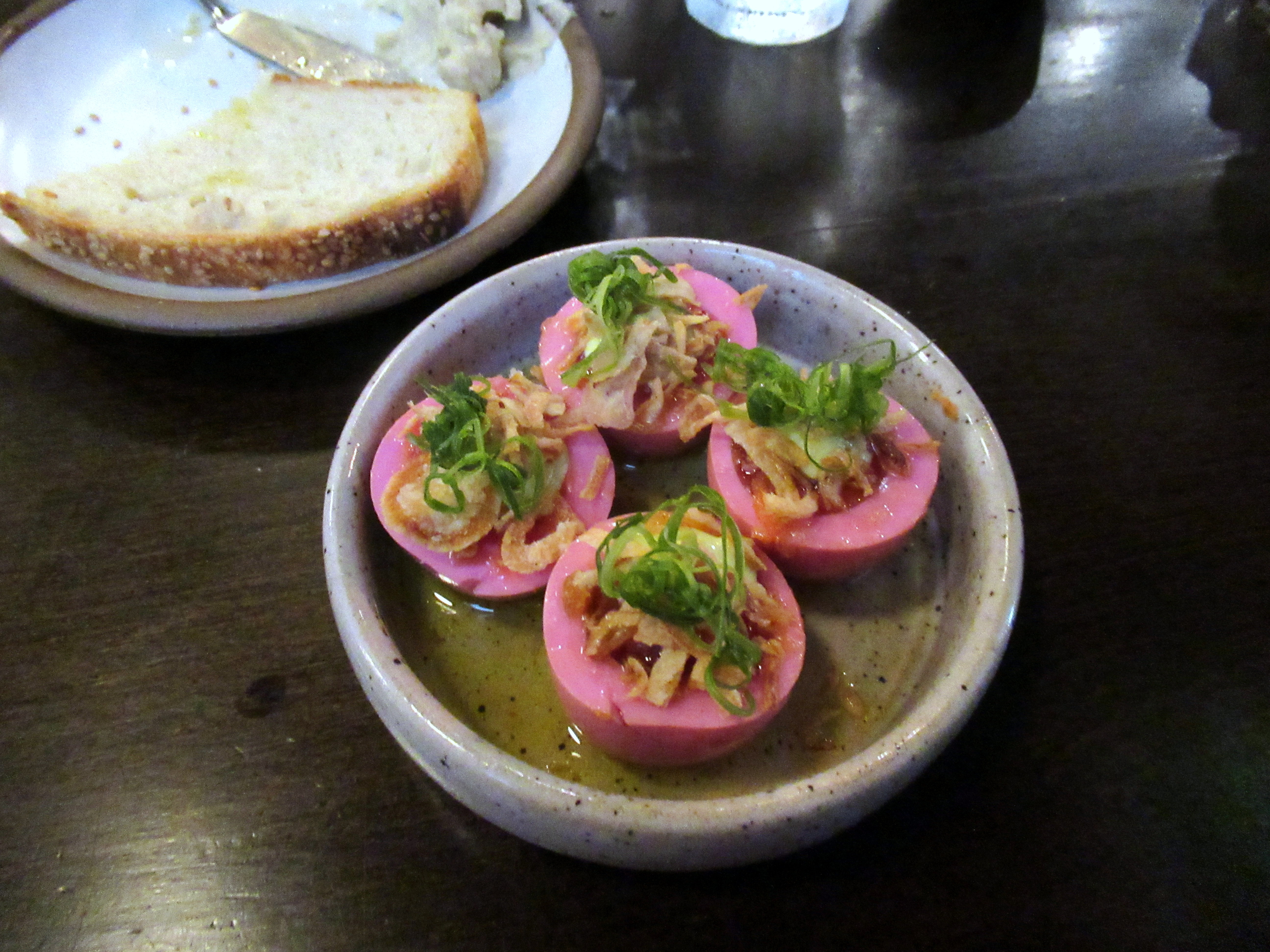 Pickled jammy eggs with good olive oil and crispy shallots.