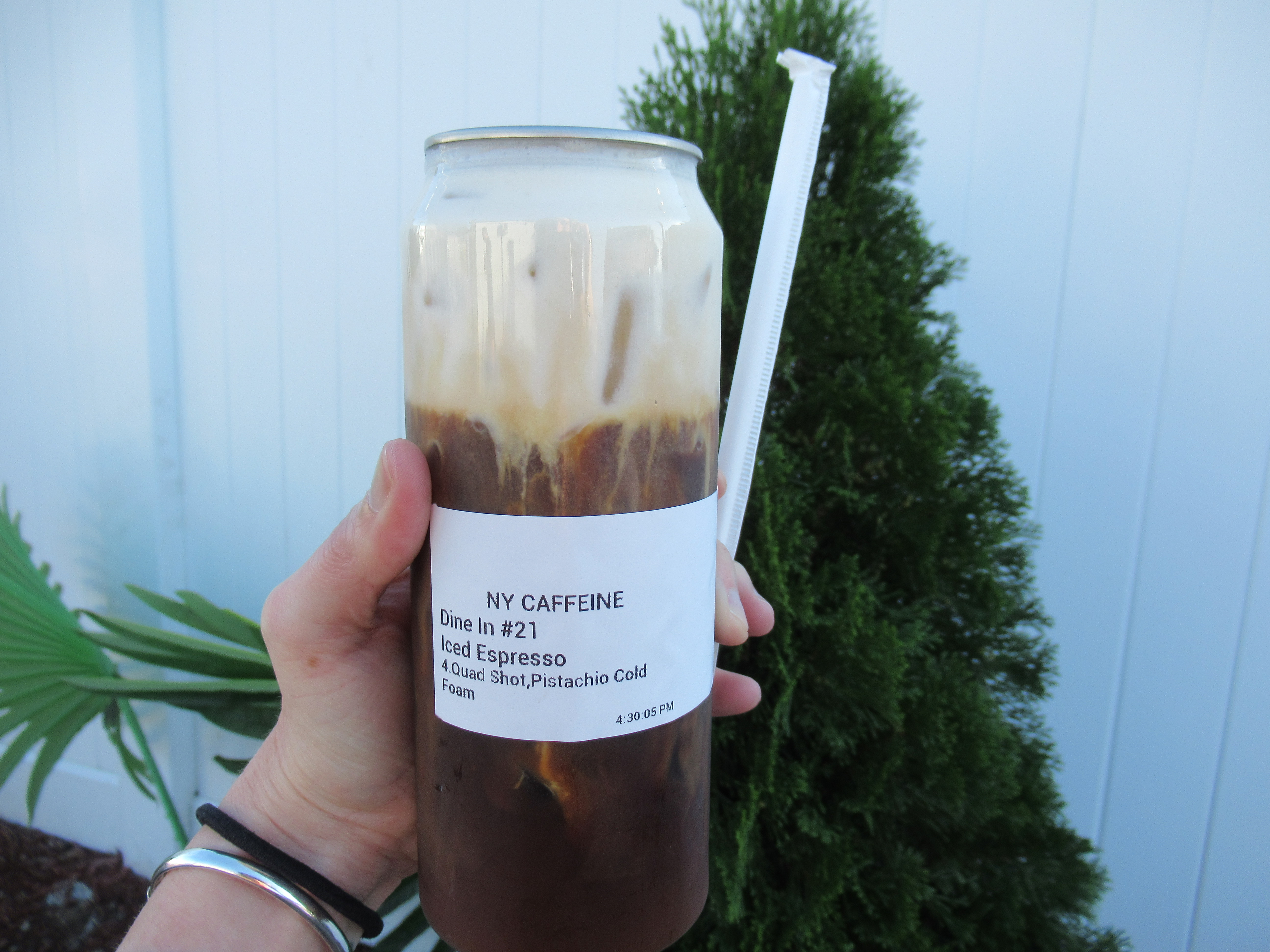 A pistachio cold-foamed iced espresso at NY Caffeine.