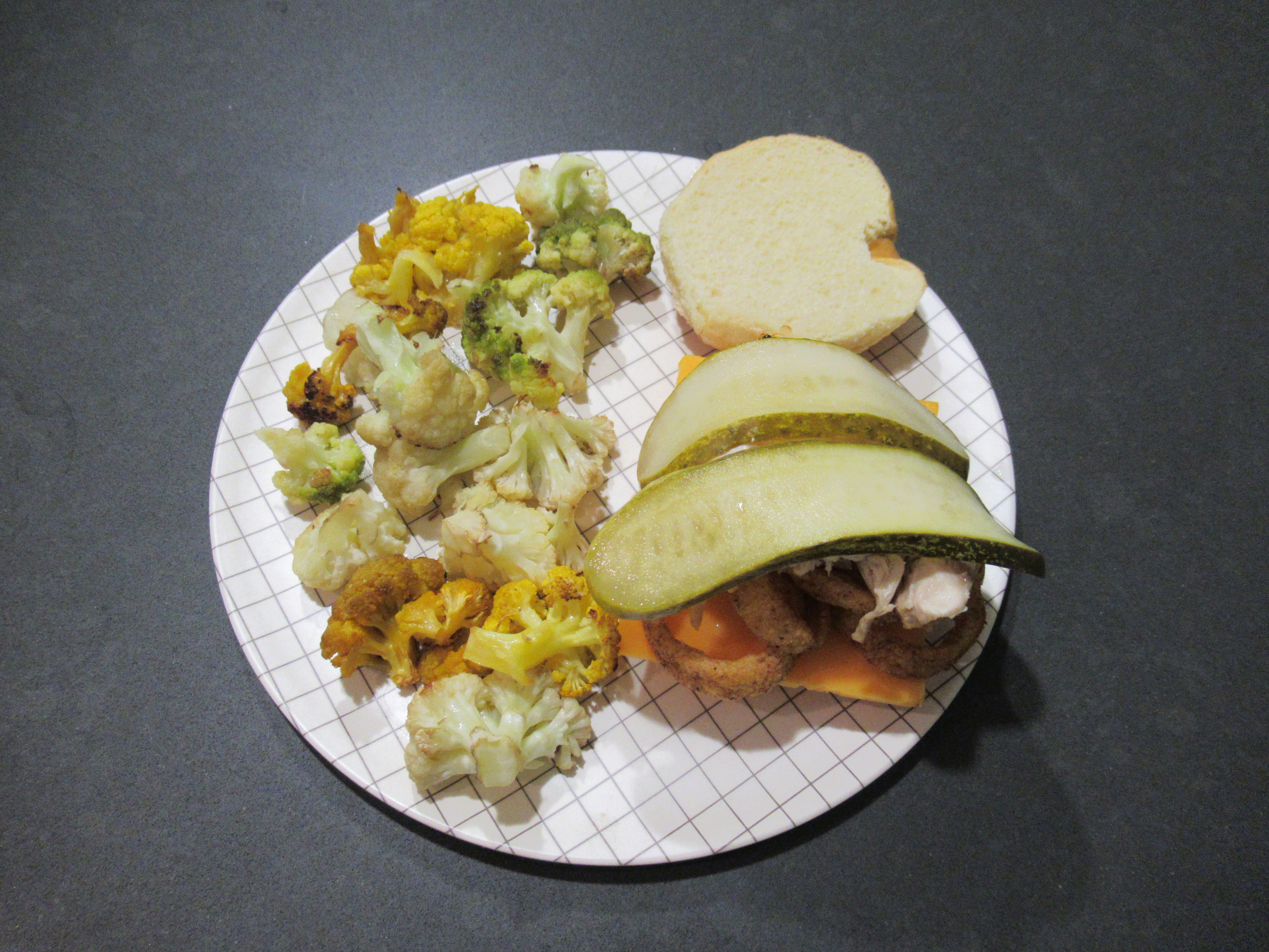 Pickle chicken sandwiches. Baked chicken breasts that I marinated in Greek yogurt and pickle juice served on King’s Hawaiian rolls with Kewpie, pickles, sharp cheddar, and steakhouse onion Funyuns. Plus roasted cauliflower.