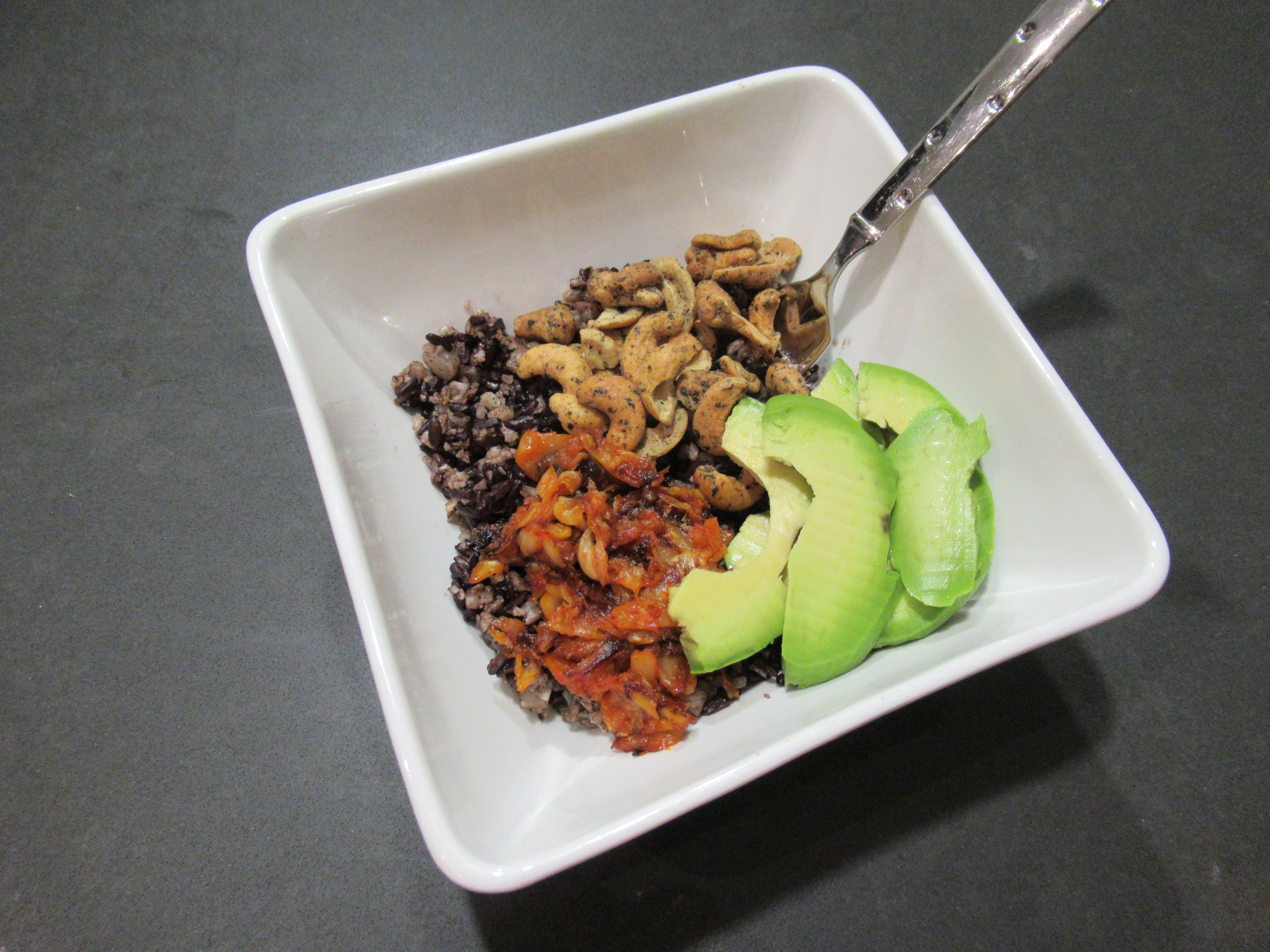 Veggie rice bowls. Jasberry rice and riced cauliflower / Whole Food’s sesame seaweed cashews / avocado / chopped kimchi crisped up with a bit of butter and sugar.