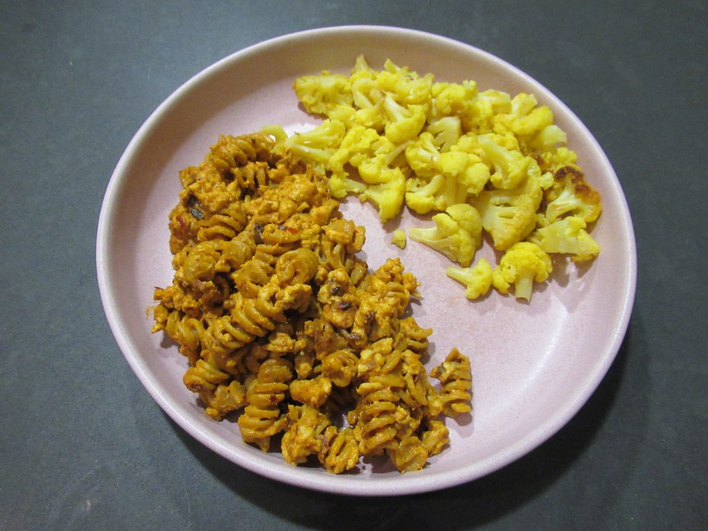 Pumpkin pasta. Whole-wheat rotini topped with ground turkey sauteed with pumpkin puree, chili crisp, and cream cheese. Plus roasted orange cauliflower.