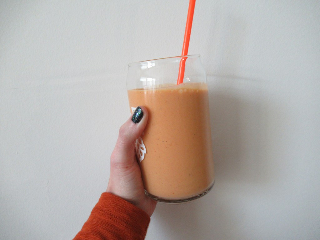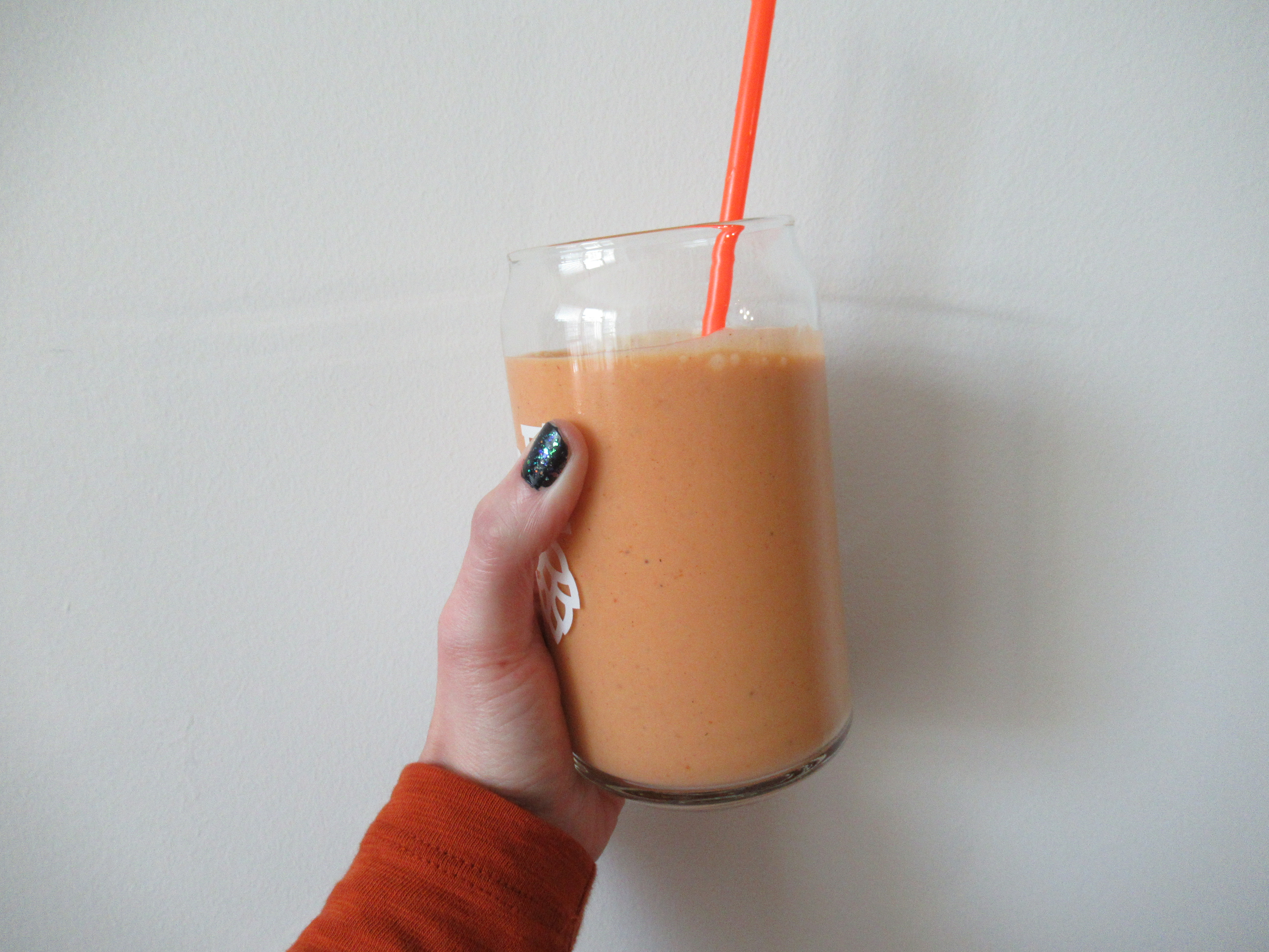 Pumpkin smoothie. Pumpkin puree, cottage cheese, frozen banana, maple syrup, cinnamon, nutmeg, vanilla bean powder, and water and ice.