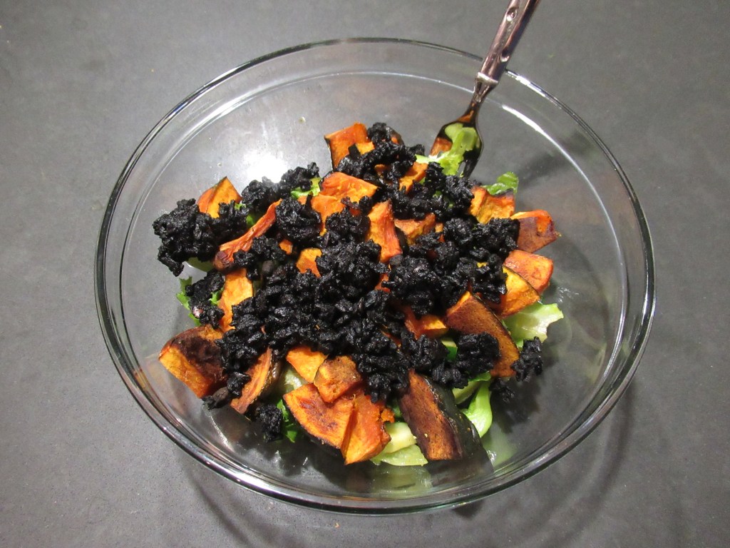 Black and orange big salads! Local lettuce / cucumber / homemade dressing – pumpkin butter, brown sugar, evoo, sesame oil, rice vinegar, and fish sauce / roasted kabocha squash / crispy rice – leftover rice tossed with chili crisp and black sesame paste and baked. We loved this.