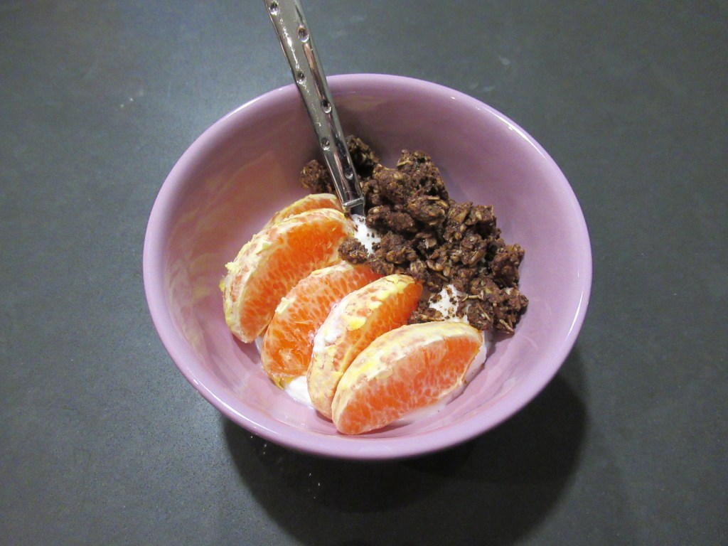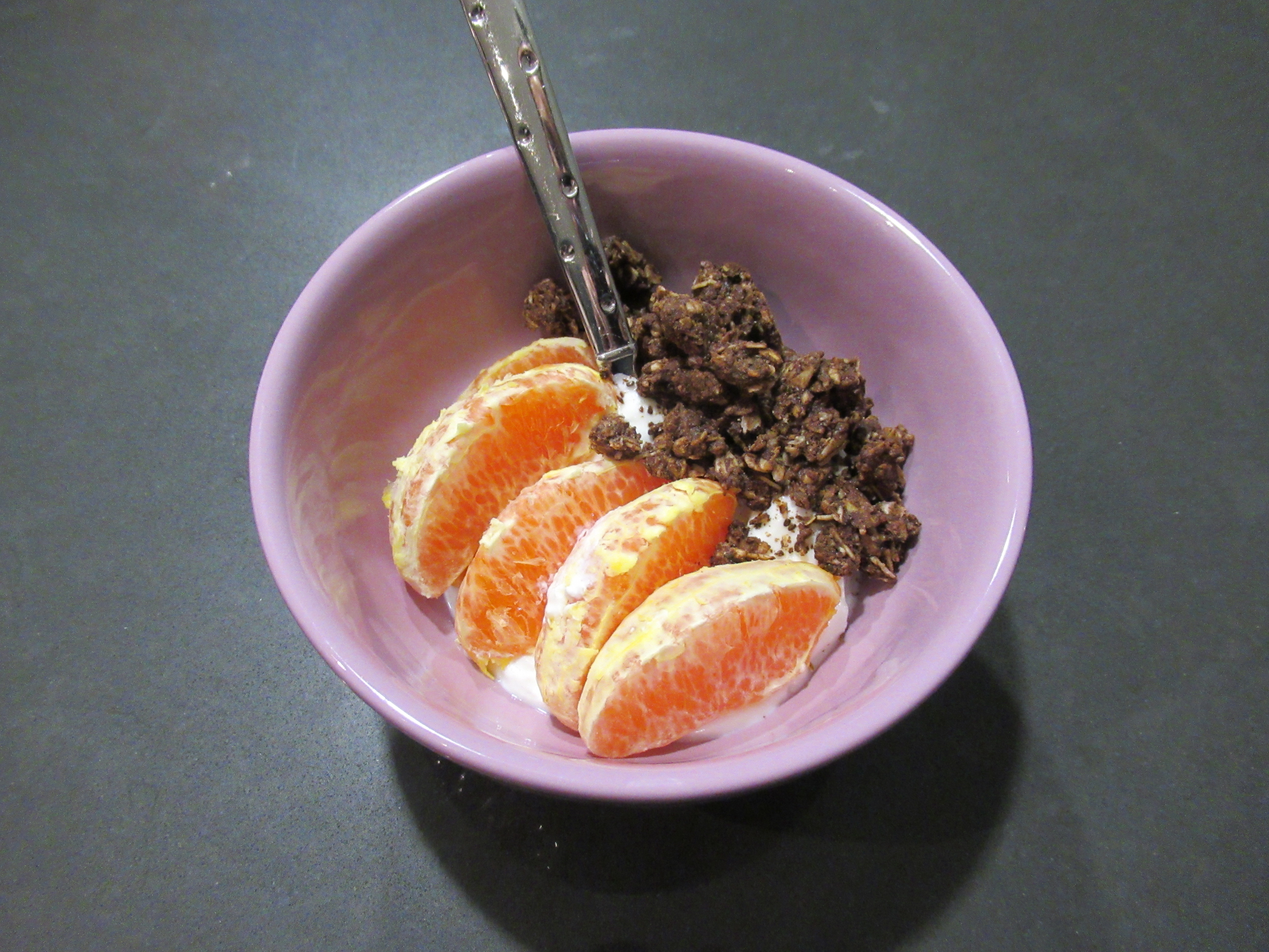 Skyr bowl with Cara Cara orange and double chocolate granola.