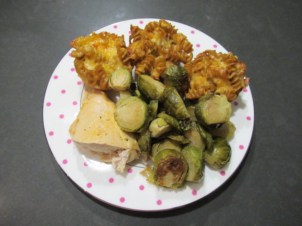 Mac and three cheese muffins with baked chicken and roasted brussels sprouts.
