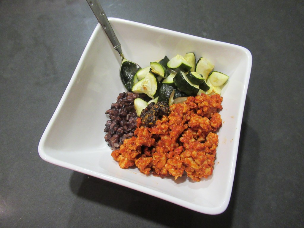 Mediterranean-ish rice bowls. Brown rice and black rice slow cooked congee-style with chicken broth / ground turkey sauteed with garlic, smoked paprika, harissa, and tomato paste / roasted zucchini / topped with local Za’atar chili crisp.
