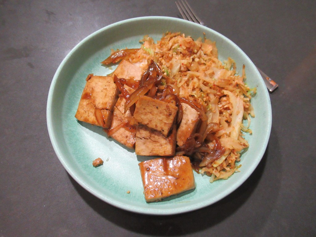 Pepper beef inspired tofu. Super-firm tofu and onions sauteed in this sauce and served on garlic sauteed cabbage.