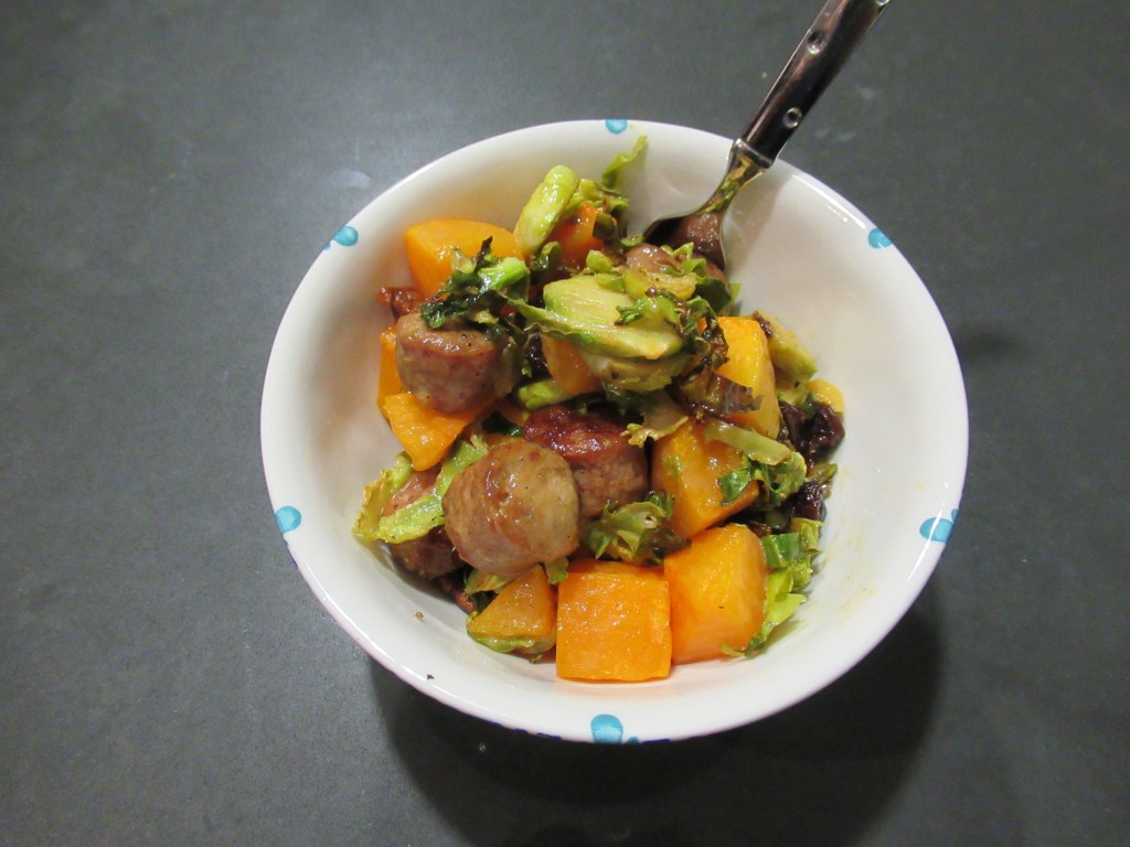 Butternut squash bowls. Roasted with roasted shredded brussel sprouts, dried cherries, Trader Joe’s sweet and spicy pecans, duck fennel sausage, and sauce (mayo, German mustard, honey, lemon juice, and Crystal hot sauce).