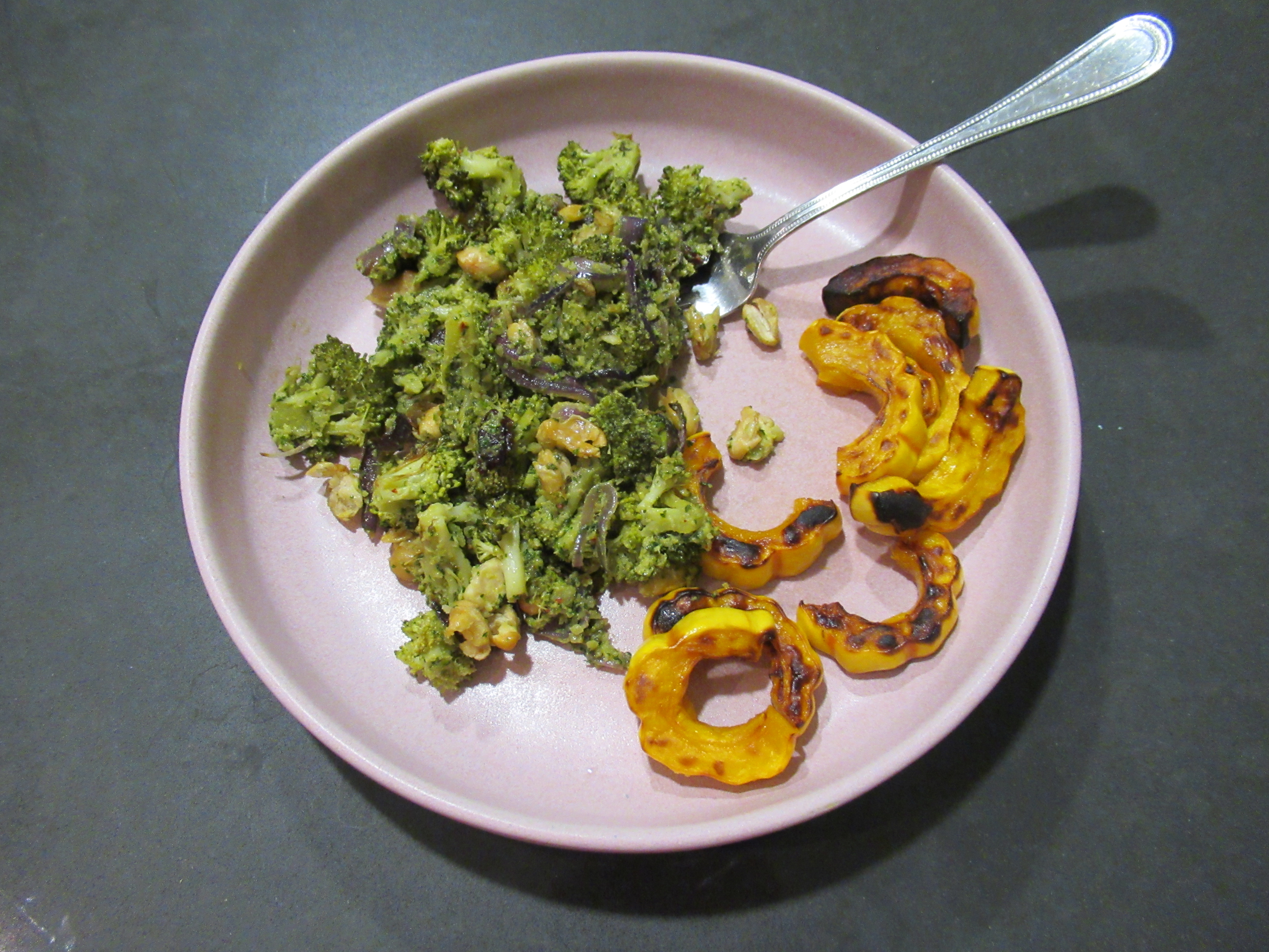 A take on our favorite broccoli salad. Roasted broccoli, red onion, and white beans with dried cherries and a fantastic sauce (food processed – cilantro, macadamia nuts, smoked sardines, gochugaru, pepper, evoo, honey, and Trader Joe’s sweet and spicy pickled jalapenos). Plus roasted delicata squash.