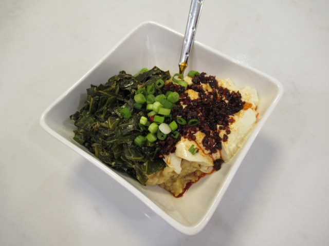 Dinners this week were all about comforting meals (and an excessive amount of unphotographed take-out!). Congee – brown rice slow cooked in chicken broth, topped with garlicy sauteed collard greens, silken tofu, chili crisp, and green onion. I loved the silken tofu texture/temperature contrasts in this.