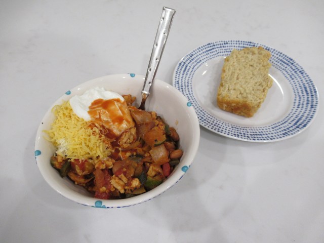 Chili when it’s chilly! We made a huge batch with ground turkey, pinto beans, sweet onion, zucchini, yellow bell pepper, poblano pepper, fire-roasted diced tomatoes, tomato sauce, and a ton of seasoning. I pre-cooked my veggies by roasting them in the oven and it worked out great. We always add fish sauce and dark soy sauce to our chili. Topped with tons of cheese, hot sauce, and plain skry. With beer bread on the side!