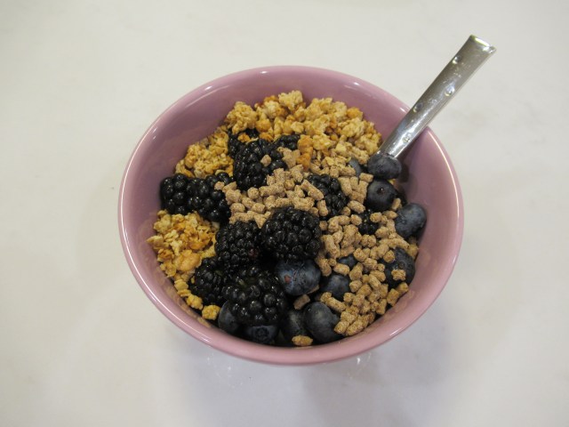 Yogurt bowl mix of the week – plain skyr with blueberries, blackberries, and granola and All Bran buds.