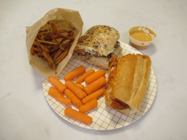 Roast sent me a coupon for my birthday month and I made good use of it. Fries with house sauce, a roast beef sandwich (with mozzarella, horseradish sauce, garlic butter, crispy onions, and an everything ciabatta), and a crispy chicken a la vodka sandwich (with sauce, mozzarella, parmesan, basil and a garlic semolina hero), and carrots from home.