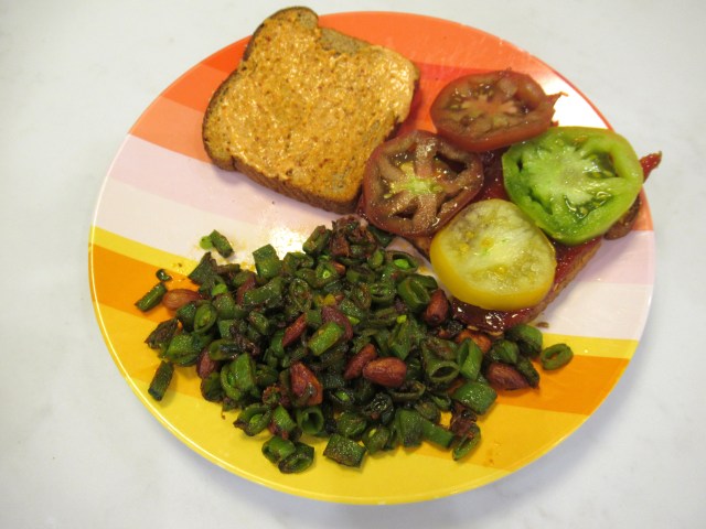 The sandwich we made ourselves the next night was even better! Fancy BLT – whole-wheat toast / sauce (Duke’s mayo with smoked paprika, gochugaru, garlic powder, and honey) / sweet and spicy turkey bacon (baked with maple syrup, brown sugar, smoked paprika, and Sriracha) / heirloom tomatoes / we hate lettuce on sandwiches. Plus delicious snap peas sauteed with smoked almonds, gouda, gochugaru, and salt and pepper.
