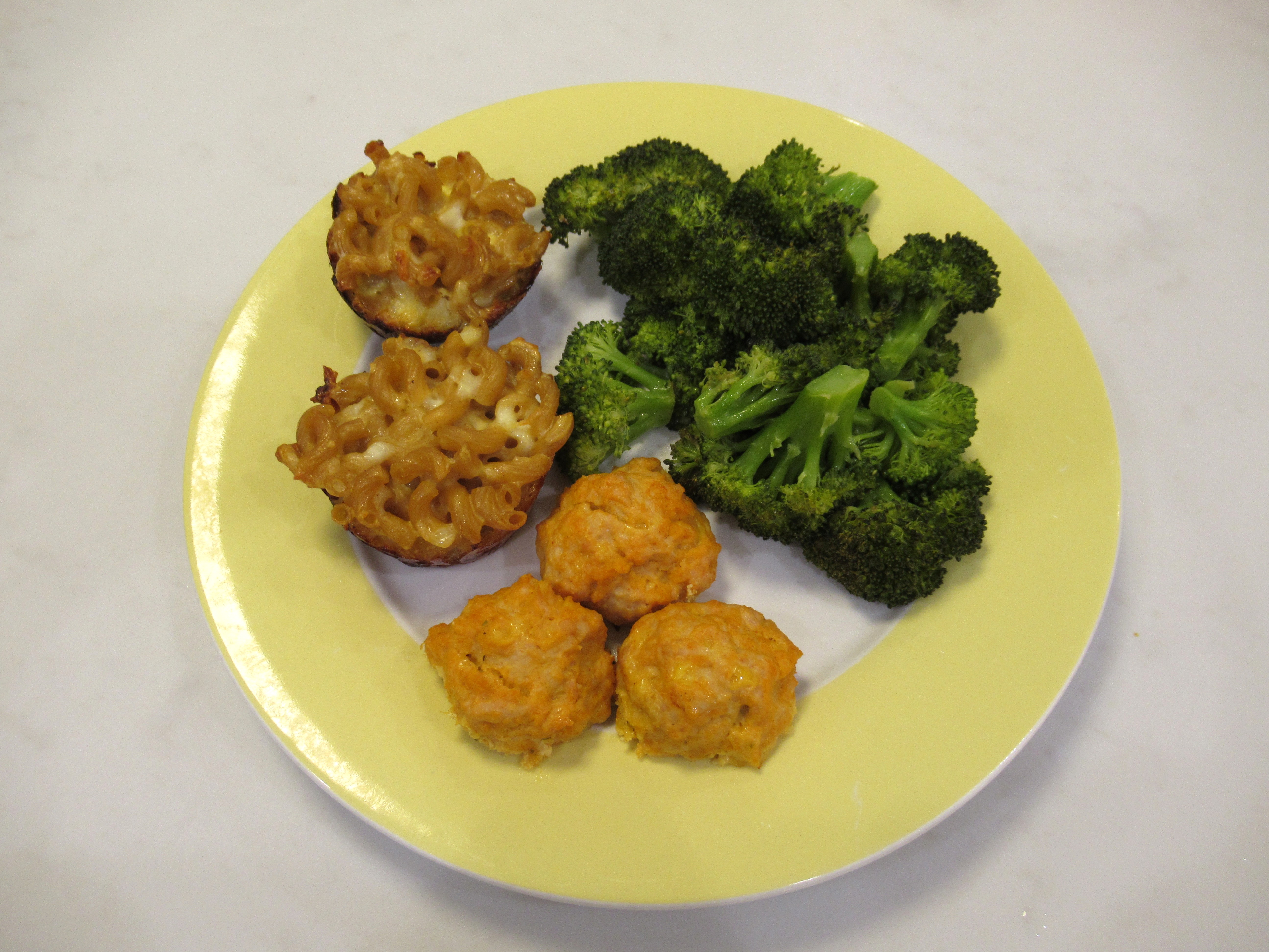 Mac and three cheese muffins made with gouda instead of cheddar / buffalo chicken meatballs – ground chicken with panade, Frank’s buffalo sauce, ranch seasoning, white pepper, eggs, and shredded gouda / and roasted broccoli.