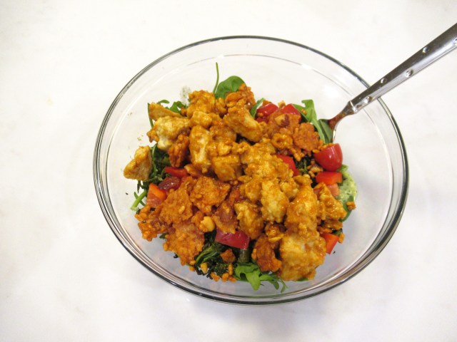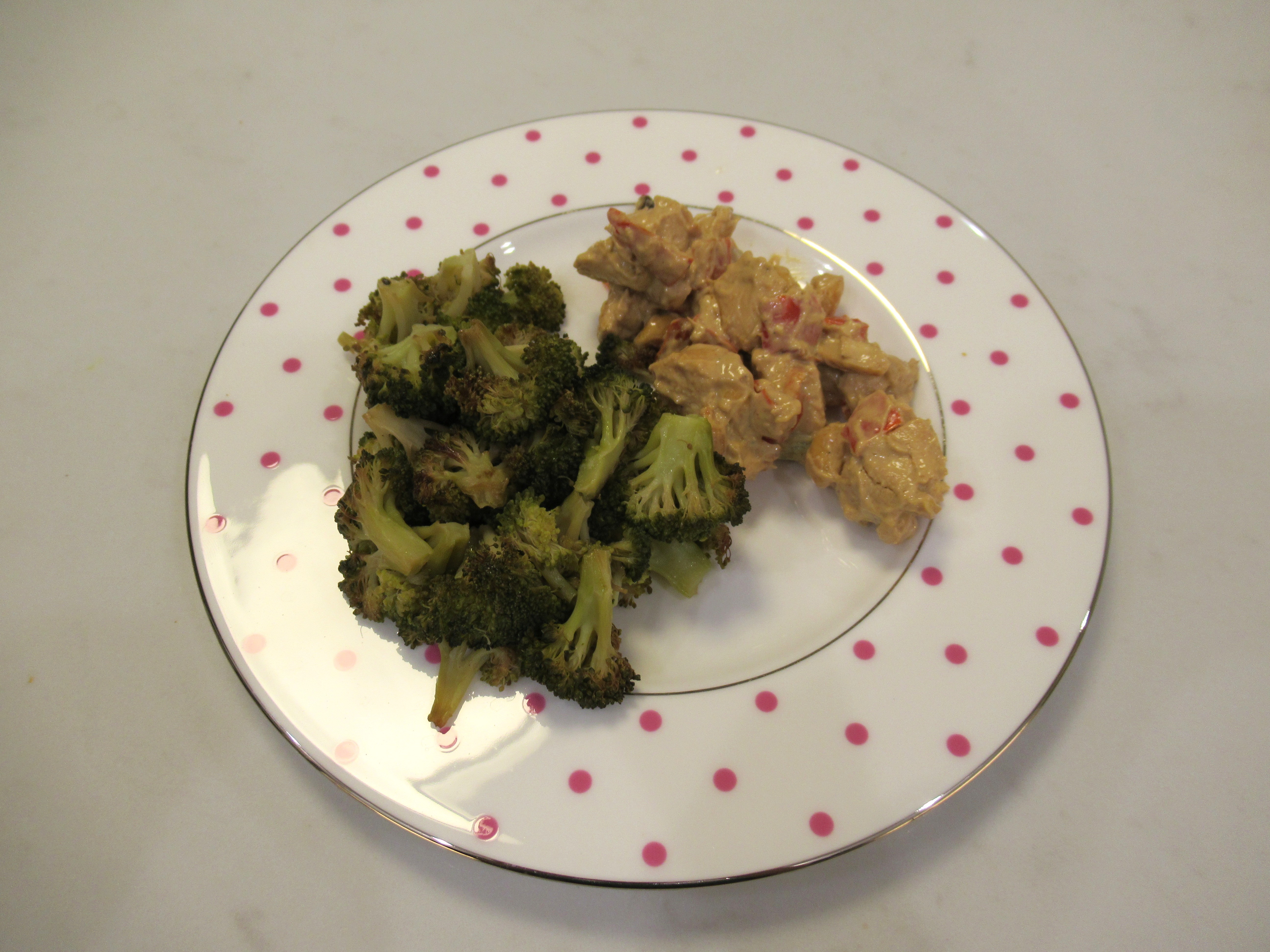 Kung Pow chicken salad. Baked chicken (marinated in skyr, rice vinegar, dark soy sauce, Chinese cooking wine, sesame oil, Sriracha, and sugar) / sauce – skyr, mayo, minced ginger, sugar, sesame oil, rice vinegar, and dark soy sauce / roasted red bell pepper and green onion / peanuts. Plus roasted broccoli.
