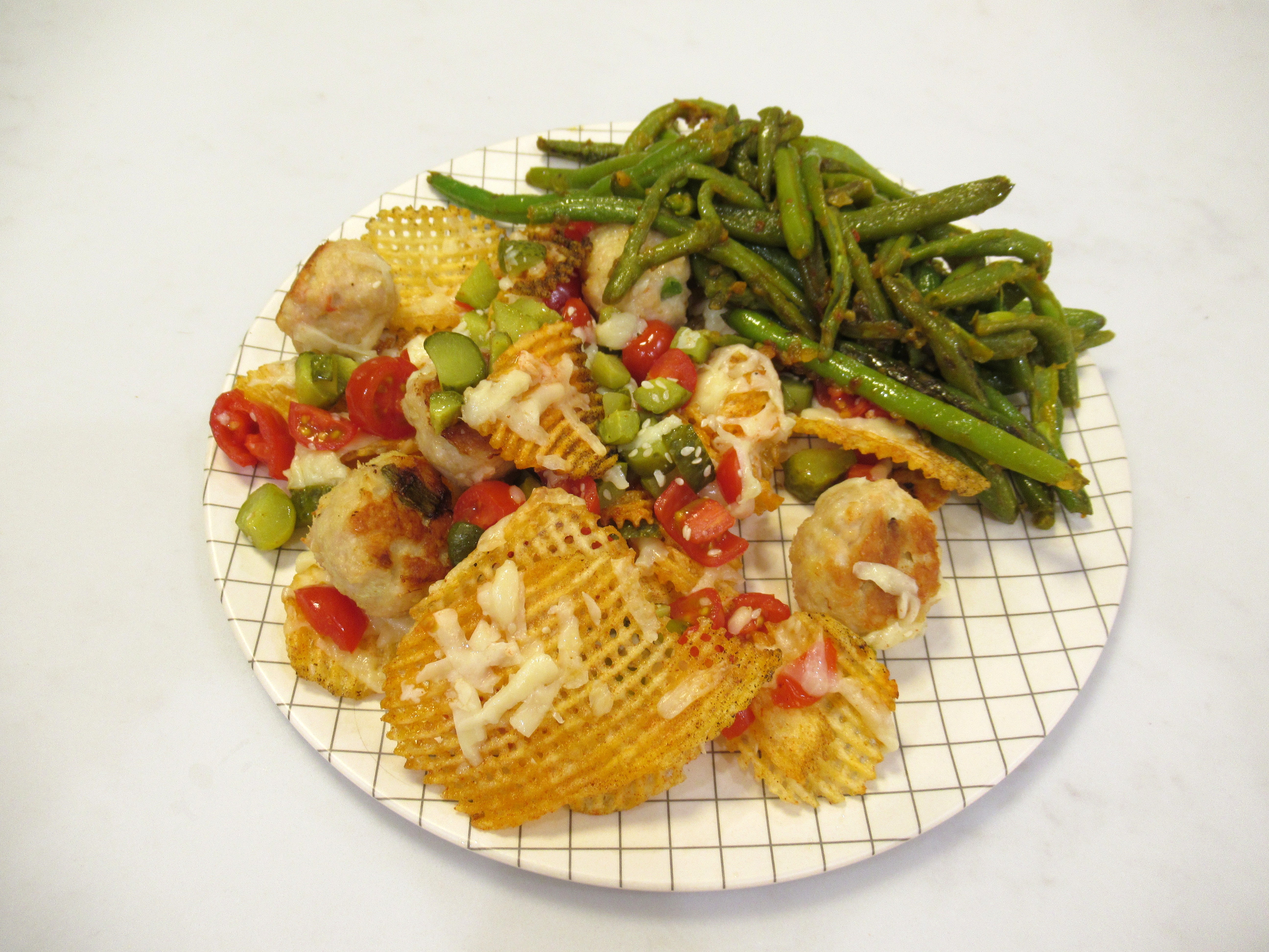 Turkey burger cheese fries. Trader Joe’s ketchup chips / Seriously Sharp cheddar / baked turkey meatballs (ground turkey with panko, mayo, white pepper, garlic powder, and onion powder) / chopped pickles and Sugar Bomb tomatoes / sesame seeds. Steamed green beans sauteed with dill pickle mustard, onion chili crisp, honey, and rice vinegar.