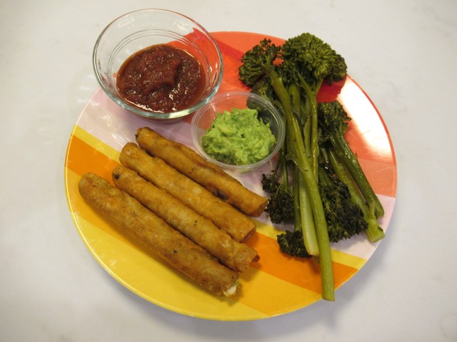 Dipping dinner – taquitos and roasted baby broccoli with salsa and homemade guacamole.