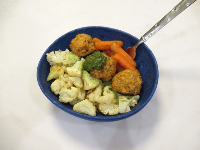 Baked turkey meatballs, roasted cauliflower, and honey butter baby carrots (baked with evoo, salt, pepper, and gochugaru) topped with Trader Joe’s Zhoug and cilantro salad dressing.