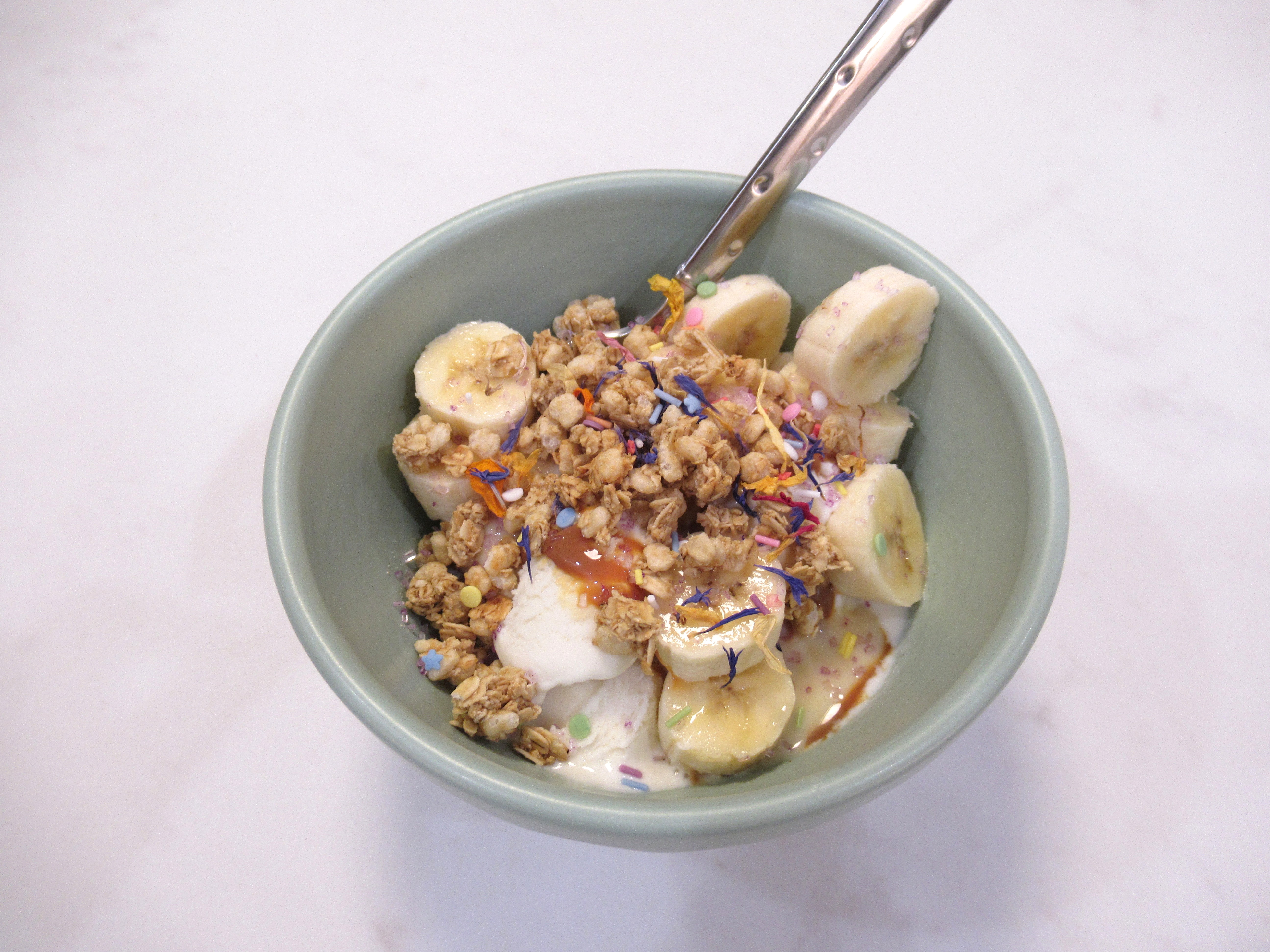 The prettiest sundae of all time. Frutero soursop ice cream topped with dulce de leche, sweetened condensed milk, sprinkles, and edible flowers.