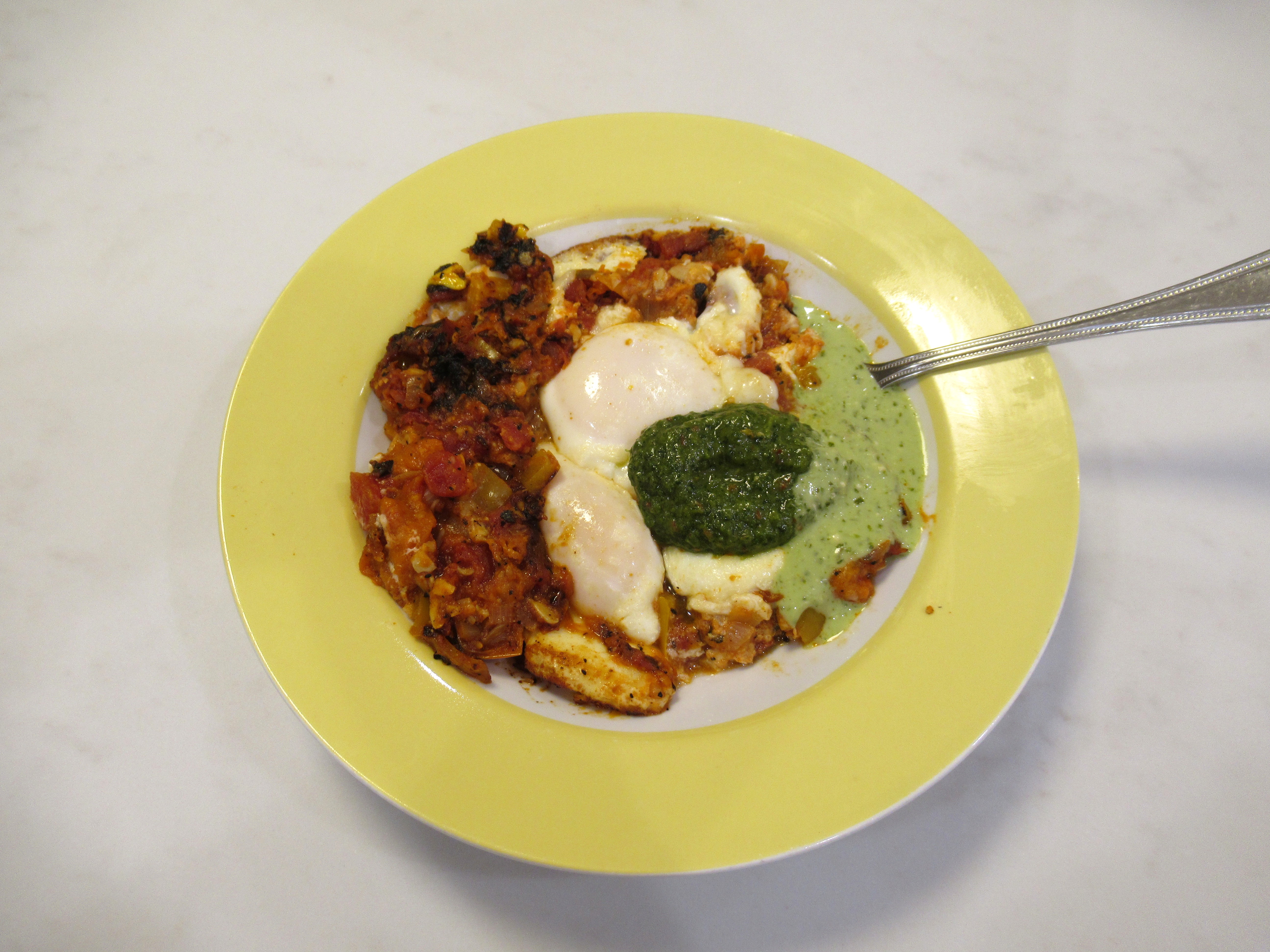 This dinner was loosely inspired by shakshuka and eggs in purgatory. Eggs, extra-sharp cheddar, and parmesan cheese cooked on a tomato-y sauce (roasted Bahama Bomb tomatoes sauteed with fire-roasted diced canned tomatoes, garlic, shallot, yellow bell pepper, urfa, smoked paprika, and salt and pepper). I topped mine with Zhoug and cilantro dressing and scooped it with sweet and spicy jalapeno kettle chips.