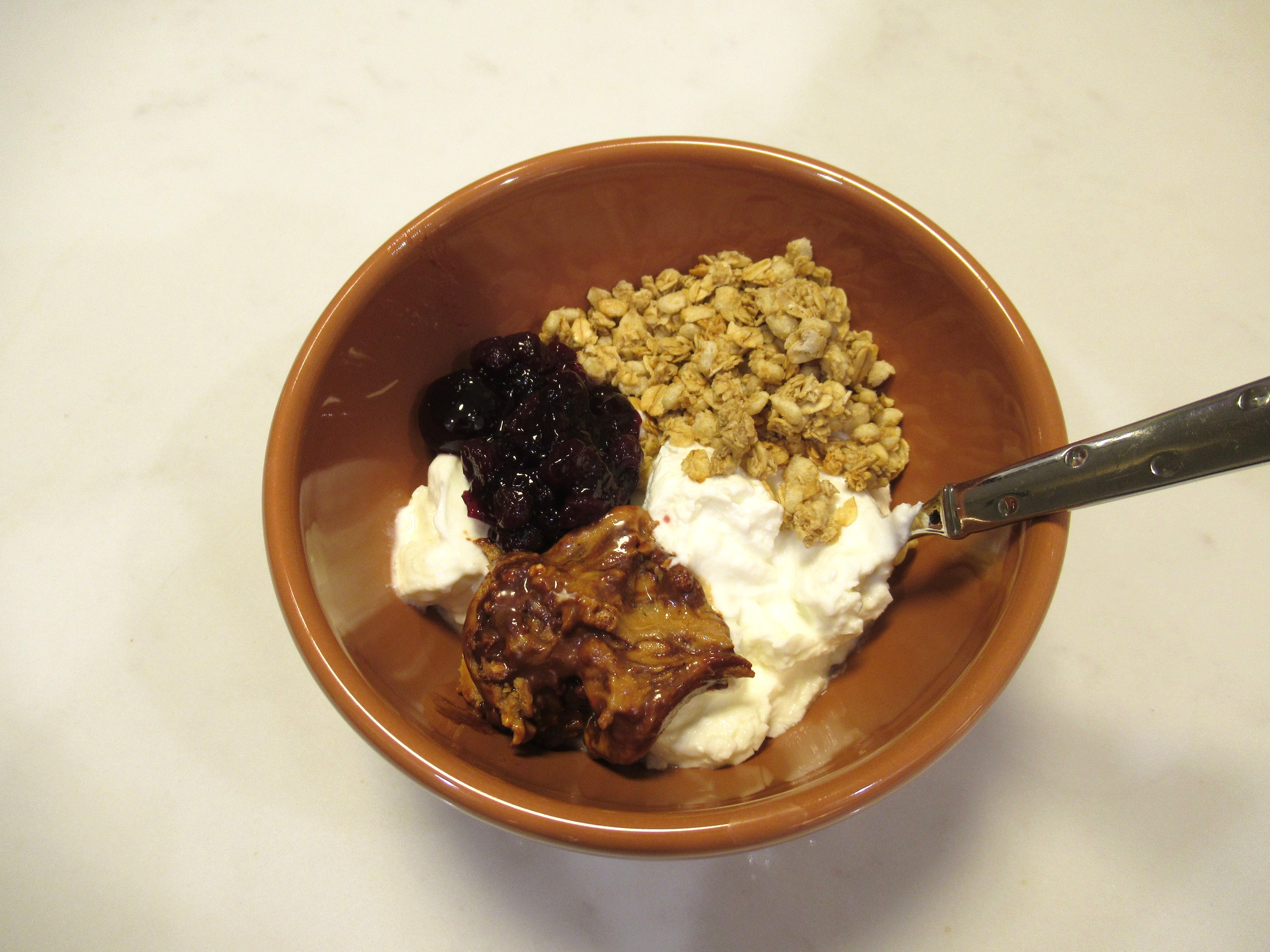 1) Peanut butter and jelly dessert-y yogurt bowl. Plain skyr with chocolate honey crunch peanut butter, Crofter’s blueberry jam, a Michigan whiskey cherry, and honey granola.