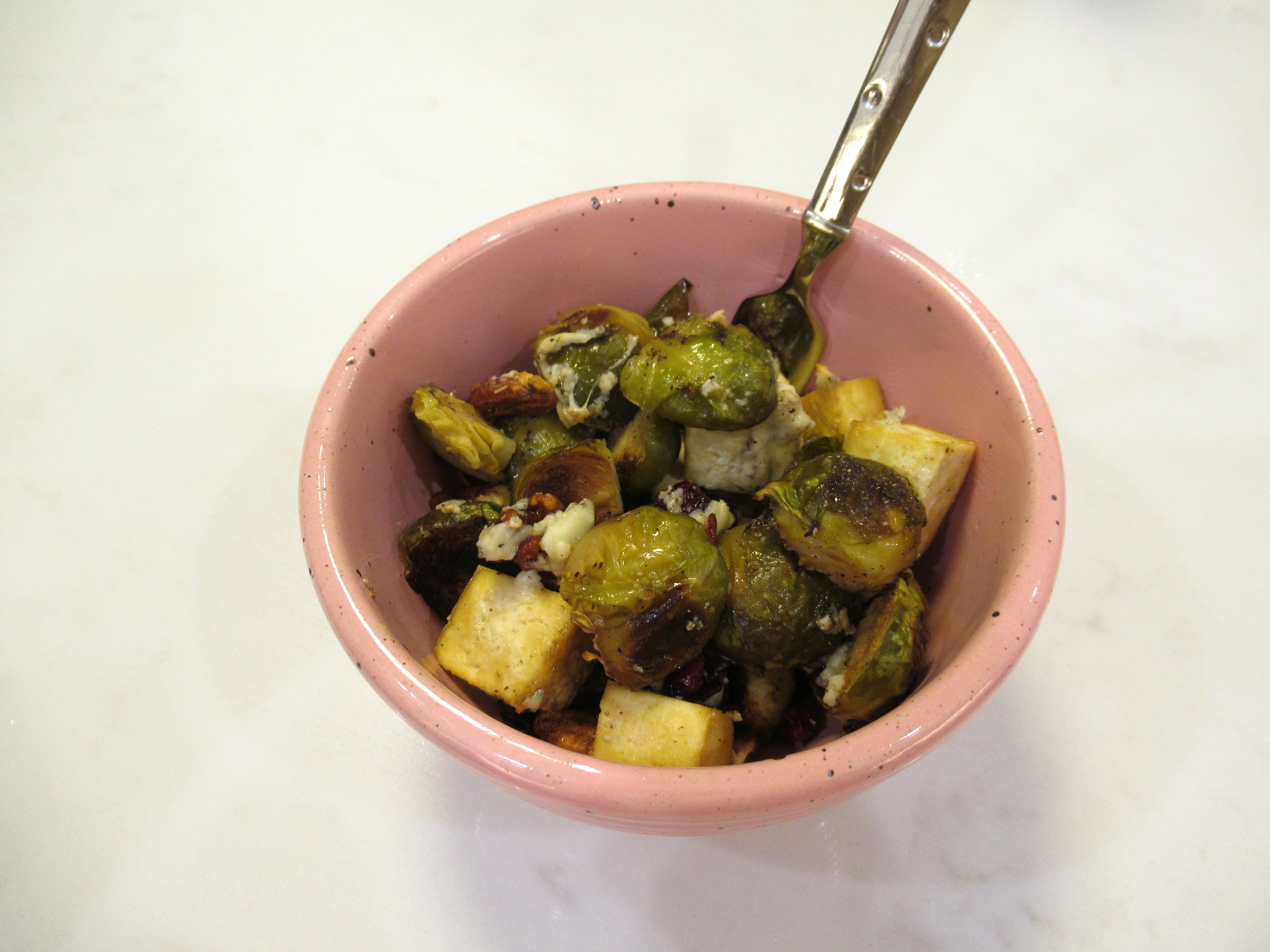 3) An easy roasted dinner. Brussel sprouts and super firm tofu with blue cheese, dried cranberries, and Trader Joe’s sweet and spicy pecans.