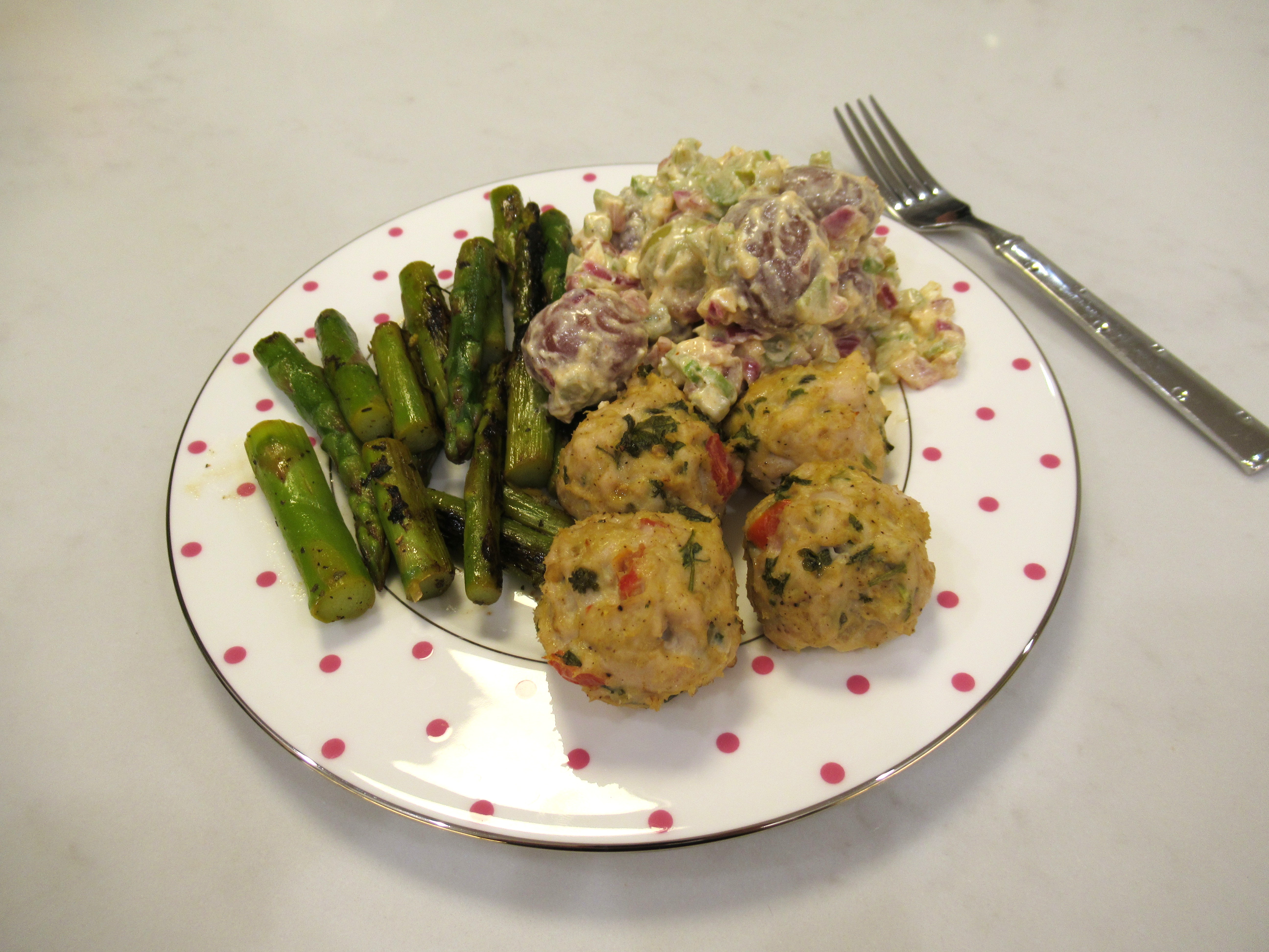 Dinners this week were all (loosely) Greek-inspired. Meatballs (ground turkey baked with panko, baba gannouj, tabbouleh, salt, pepper, and egg) / asparagus sauteed with lemon, dried basil, salt, and pepper / potato salad (peewee potatoes with sauteed celery and red onion, feta, lemon zest and juice, evoo, skyr, mayo, smoked paprika, and white pepper).