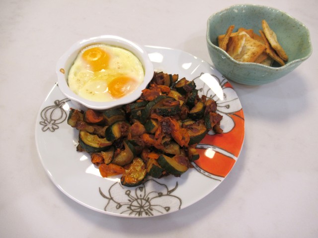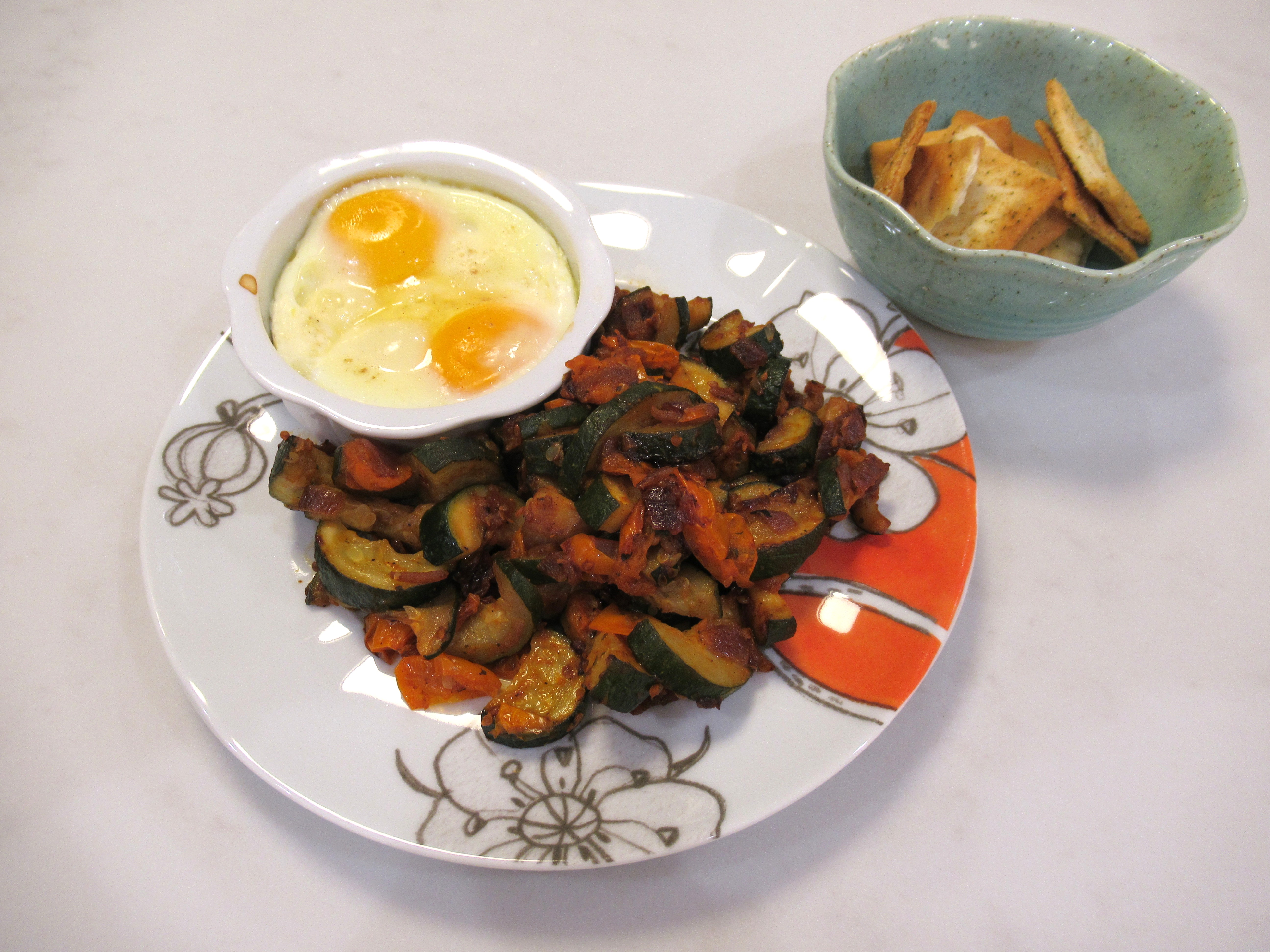 Baked eggs with feta plus sauteed zucchini, Bahama Bomb tomato, and red onion with salt, pepper, and dried basil. Scooped with pita chips.