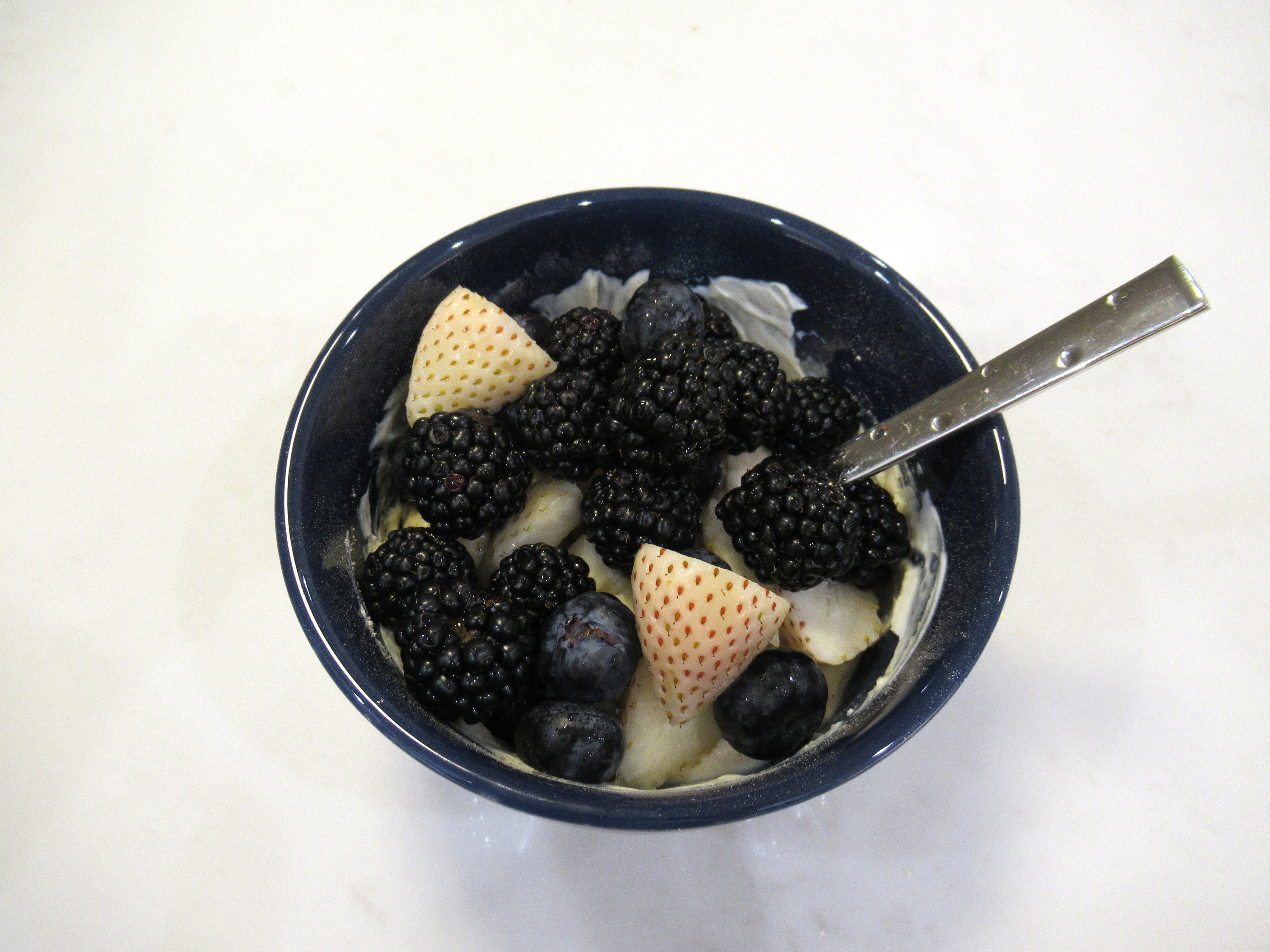 This one was plain skyr, vanilla bean powder, vanilla protein powder, maple syrup, and all the berries.