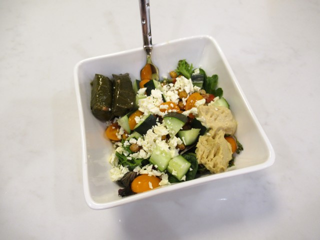 Salads. Spring mix, Trader Joe’s cilantro dressing, roasted chickpeas, tomatoes, cucumber, feta, baba gannouj, roasted garlic hummus, and Trader Joe’s dolmas.