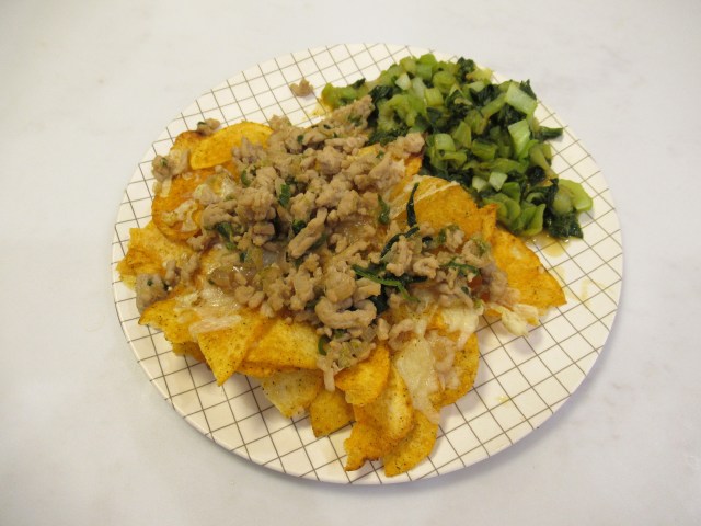 Trader Joe’s Thai yellow curry potato chips needed to be turned into nachos. With two types of sharp cheddar and a loose take on Thai basil chicken. Plus bok choy sauteed with ginger, white pepper, and hoisin sauce.