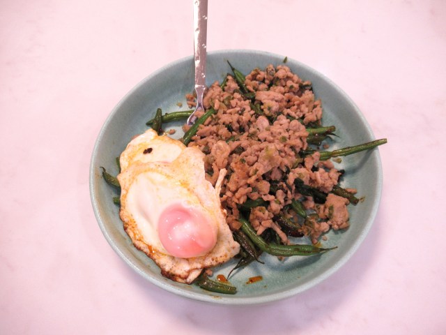 I enjoyed my chicken leftovers in a bowl with fried eggs and green beans that I steamed then sauteed with chili crisp, Dijon, and maple.