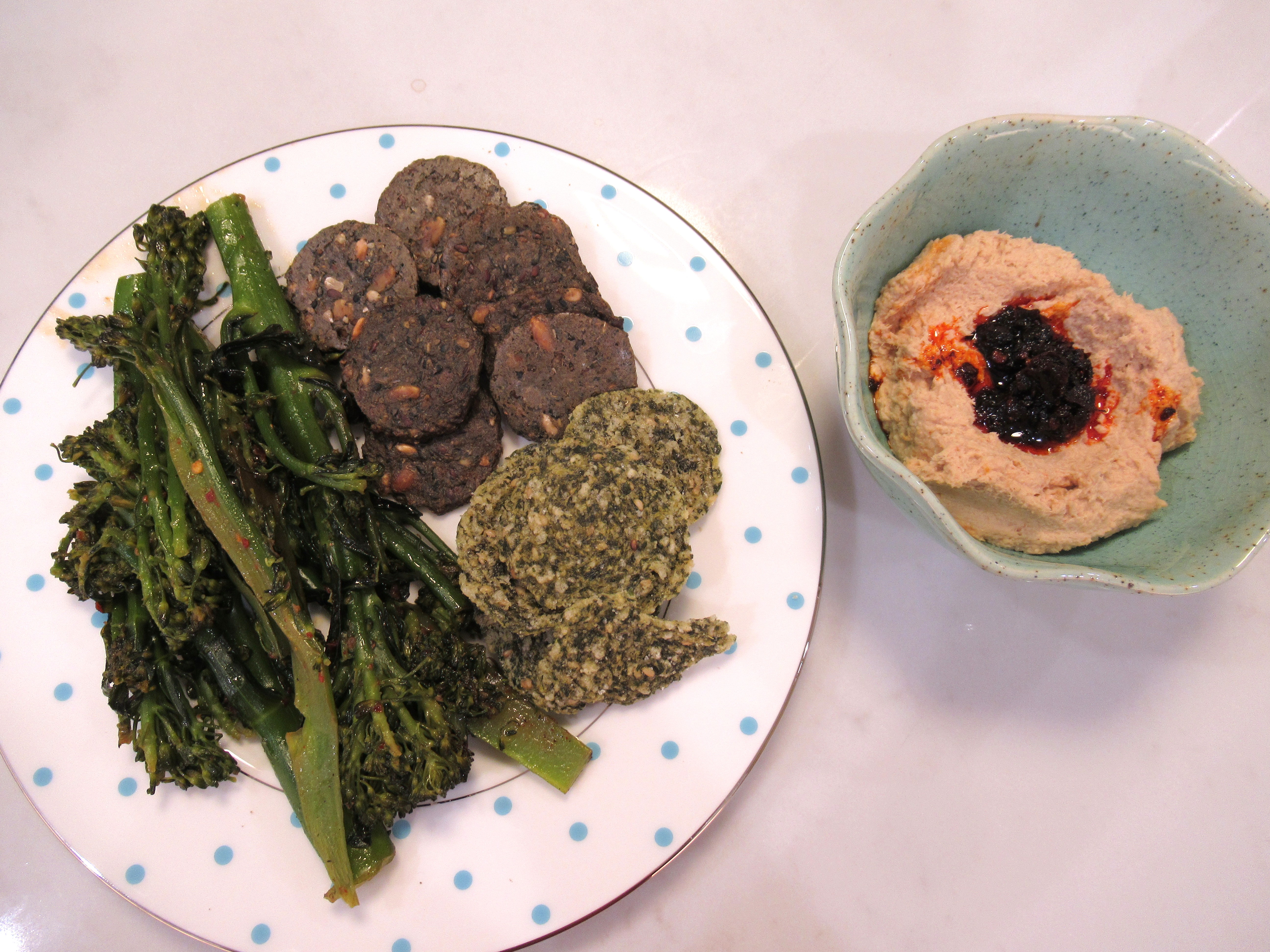 Fish dip dinner. Canned pink salmon and lightly smoked salmon, Dukes, Kewpie, Dijon, lemon, paprika, garlic powder, onion, powder, and white pepper, food processed, then topped with chili crisp. Served along side baby broccoli sauteed with salt, pepper, gochugaru, Milu everything seasoning, butter, and lemon.
