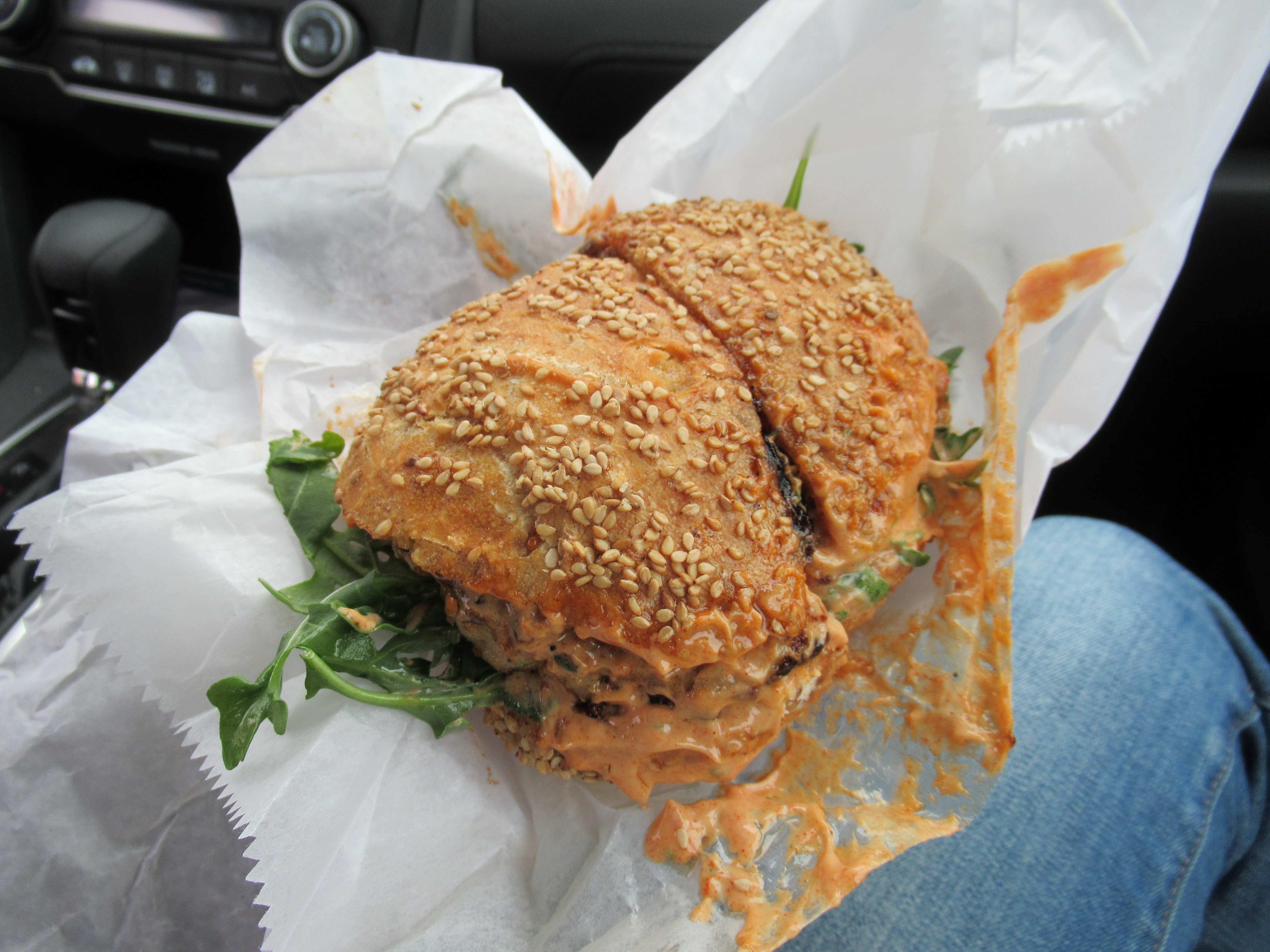 Salty Lunch Lady‘s (always a joy!) Chicky-smashed chicken meatball, charred onion, feta, arugula, and smoked paprika mayo on a seeded bun.
