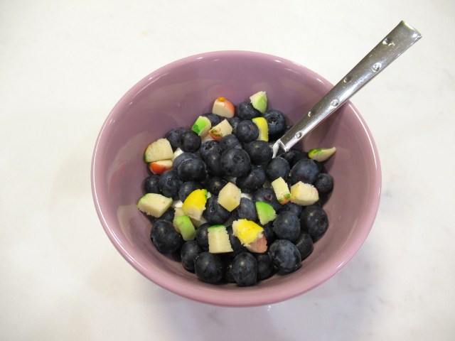 The best yogurt bowls = plain skyr with tons of blueberries and chopped marzipan.