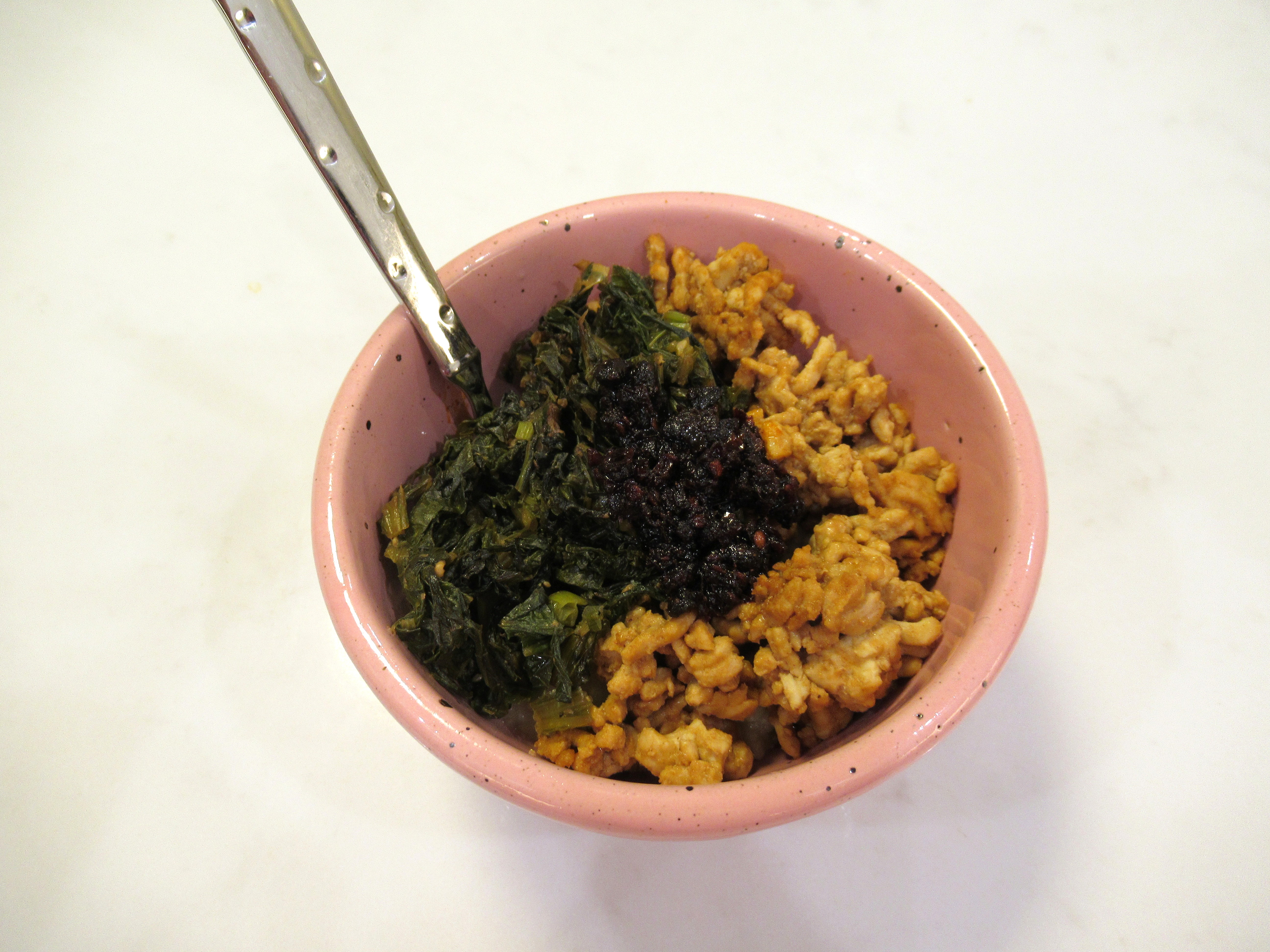 Congee bowls. Brown rice slow-cooked with chicken stock / mustard greens and scallion sauteed with soy sauce, rice vinegar, garlic, and pepper / ground turkey sauteed with peanut butter, lime, brown sugar, Sriracha, dark soy sauce, fish sauce, and chicken broth / chili crisp.