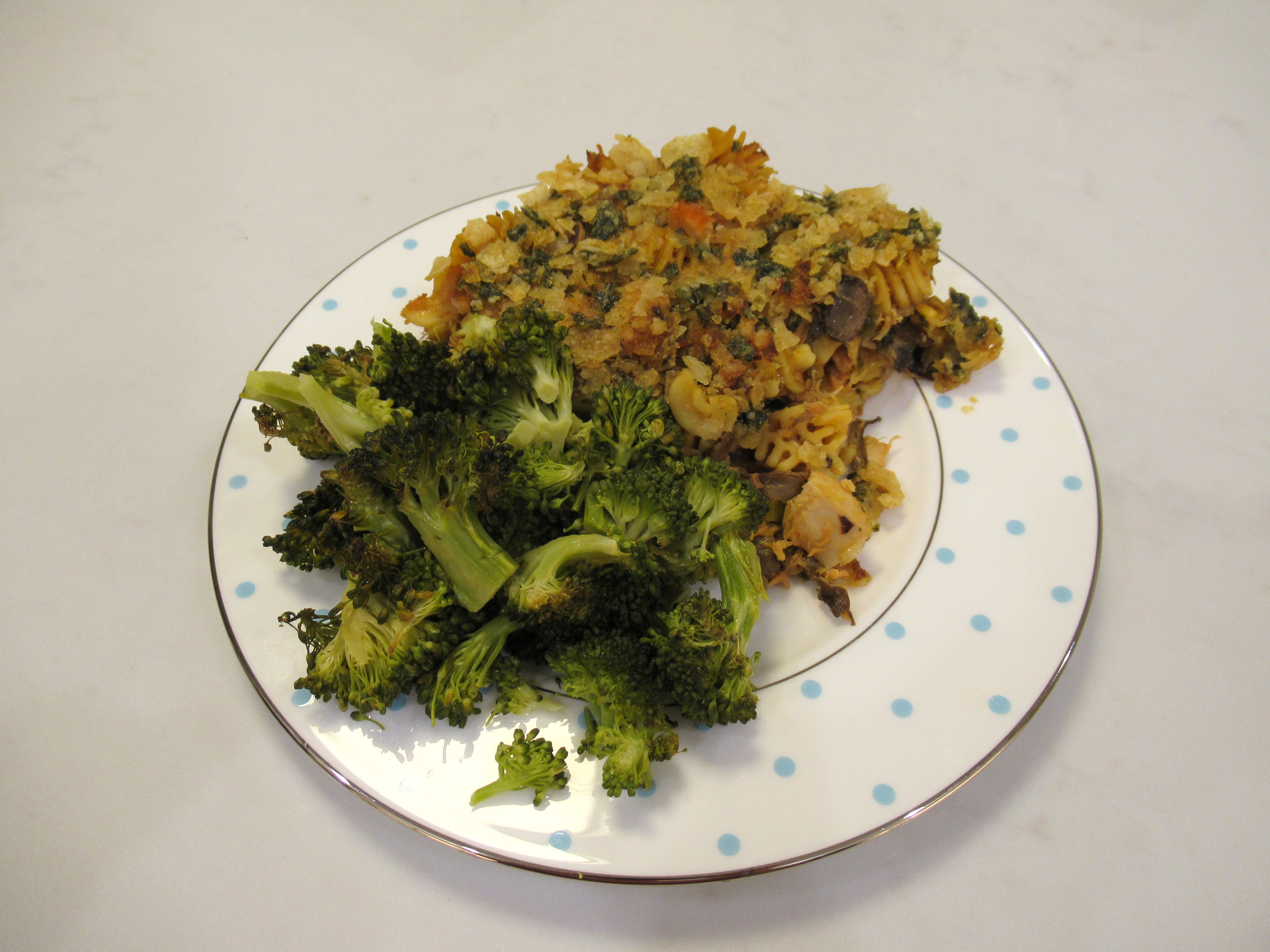 Tuna noodle casserole. This came out so well! Brami radiatori protein pasta, canned tuna, and canned trout / mushrooms, leek, and red scallions sautéed with flour, corn starch, veggie broth, gochujang, fish sauce, and sesame oil / baked topped with a mix of crushed honey butter chips and seaweed chips. Plus roasted broccoli.