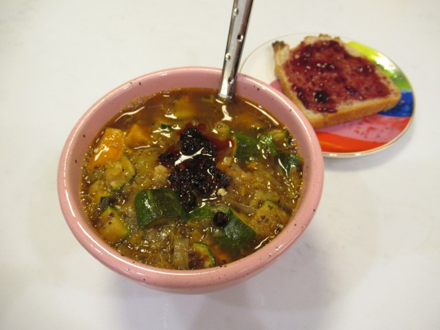 One of the best soups I’ve ever made – leeks sauteed with salt, garlic powder, onion powder, and smoked paprika / extra-garlicy chicken meatballs / roasted sweet potato and zucchini / chicken broth. I topped my bowl with chili crisp. Plus a side of sourdough with blueberry jam.