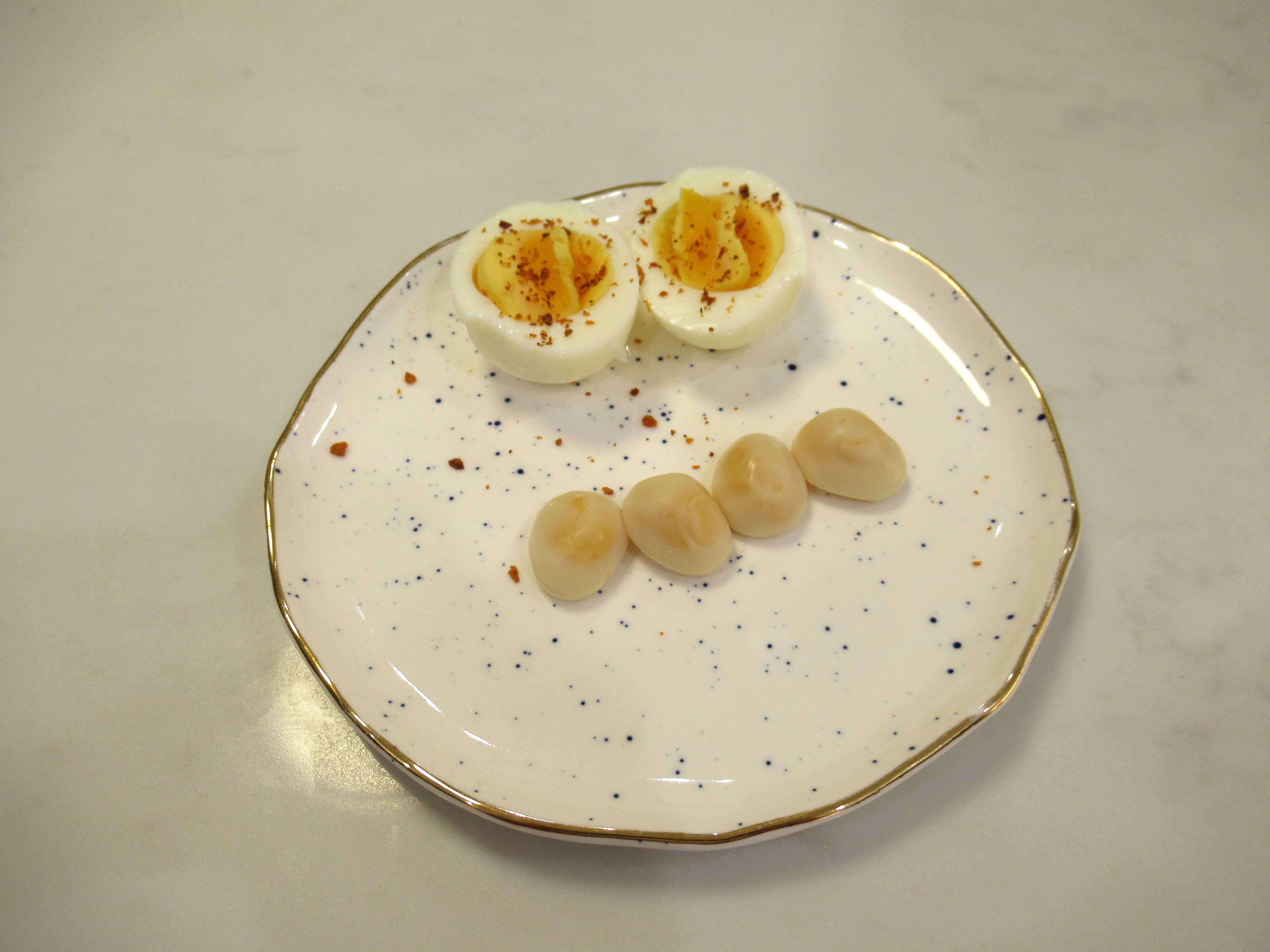 An eggcellent snack – hard boiled egg with Milu everything spice alongside Peelerz caramel pudding gummy eggs (<– the fruit flavors are better but this was obviously fun).