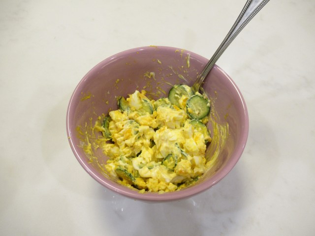See also – an easy egg salad. Hard boiled eggs smashed with mayo, plain skyr, yellow mustard, and leftover marinated cucumbers.