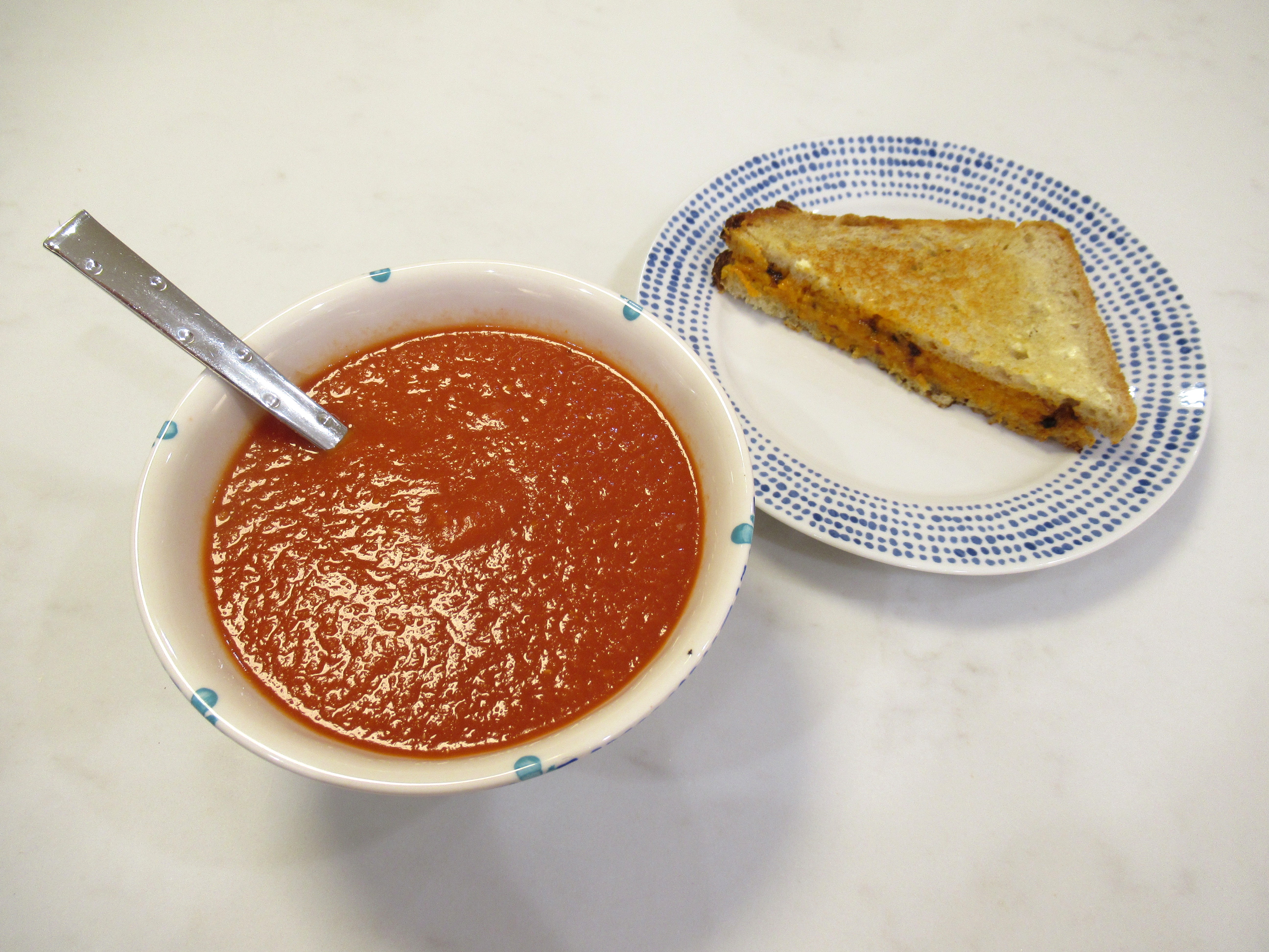 Homemade tomato soup. In the blender – white onion sauteed with butter / cannellini beans / canned whole peeled tomatoes and tomato paste / veggie broth, white pepper, and dark soy sauce. Paired with a grilled cheese, of course; sourdough, mayo, extra-sharp cheddar, honey, and chili crisp.