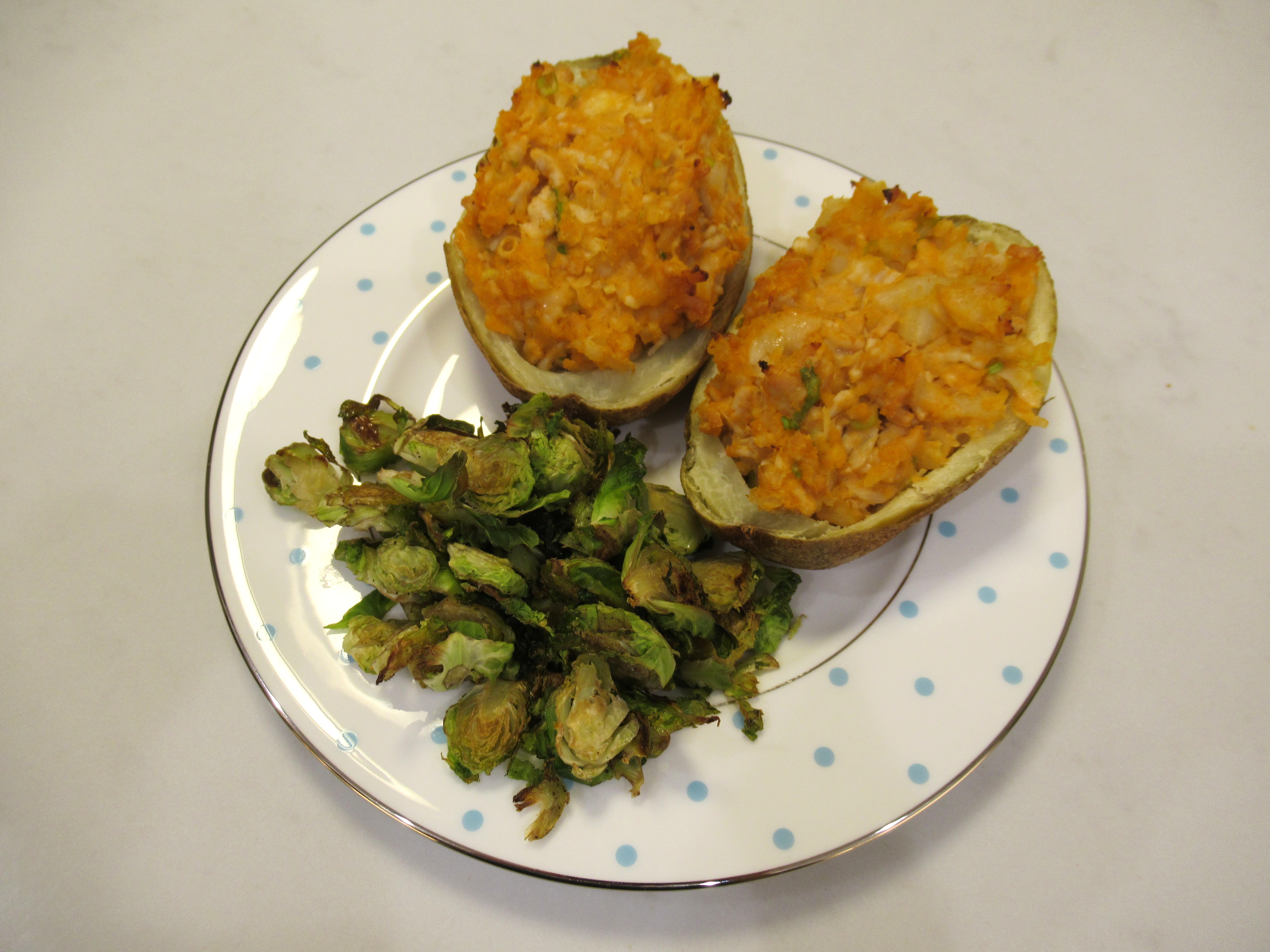 I’m usually committed to the bit but a final night of soup felt like too much so we had twice-baked potatoes and roasted brussels sprouts instead. Turkey Reuben twice baked potatoes – with sauteed ground turkey, homemade Russian dressing, sourkraut, and white cheddar.