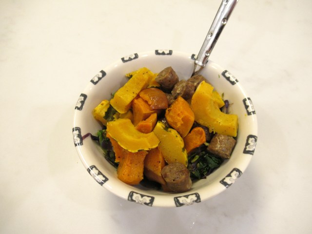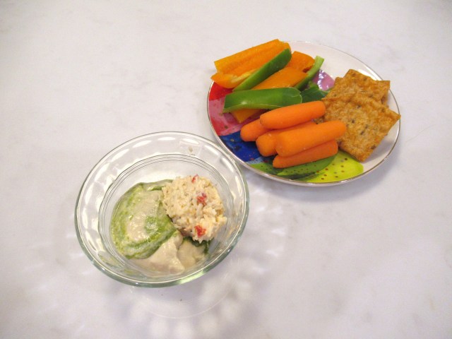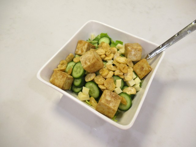 Kitchen sink salads. Romaine with Trader Joe’s cilantro dressing, jalapeno hummus, cucumber, raisins, walnuts, crispy broad beans, extra-sharp cheddar, and baked sprouted tofu.