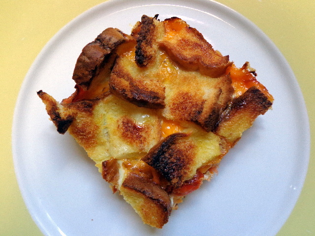 - Divide the bread pieces in half. Arrange half of the bread pieces in the bottom of the prepared casserole dish. Cover bread with an even layer of cheese and salmon; you may want to break up the fish a bit more with your fingers while you spread it. Evenly top fish and cheese with the remaining bread.