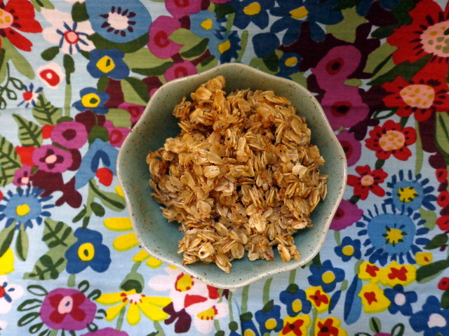 This granola is cooked on the stove top so it comes together in a snap! The end results belie the speed of the process though; this is perfectly crunchy and sweet. Each 1/3 cup serving has ~200 calories.
