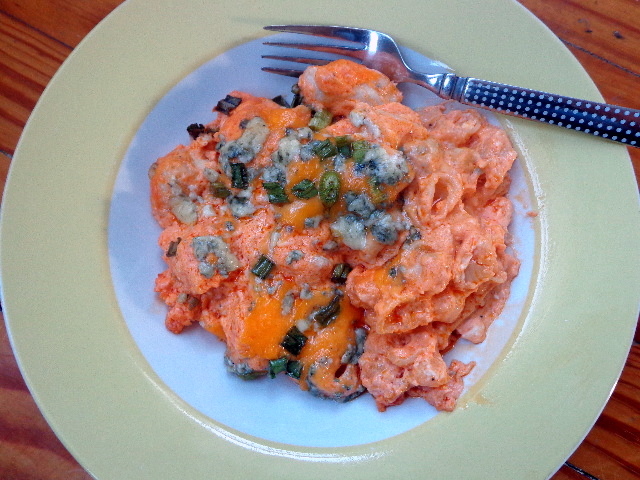 When I made this dish I was not planning on sharing the recipe (I just really wanted Buffalo Chicken Mac and Cheese!). But then it tasted so good. This recipe is not, I repeat not healthy. But it is tasty, yummy, cheesy, spicy, decadent, comforting, and delicious. Also, it’s easy. Using cream cheese as the base means you don’t have to worry about scorching milk while you try to make a cheese sauce. Have vegetarians coming for dinner? Skip the chicken. It’s sounds sacrilegious to true wing fans but I promise the macaroni can support the spicy goodness all on its own.
