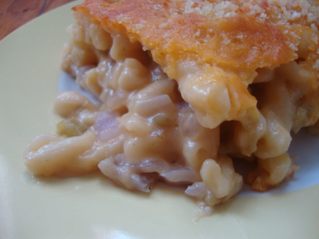 - In a large bowl, toss together peppers and onions, cooked pasta, and cheese sauce. Carefully pour into casserole dish. Top with panko and remaining handful of cheese. Drizzle remaining 2 tsp of oil over the top.