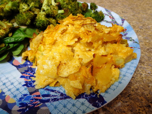 - Remove pan from heat and stir in pasta, green onions, and crab, tossing until mixture is well-combined. Pour into prepared casserole dish and top evenly with crushed chips.
