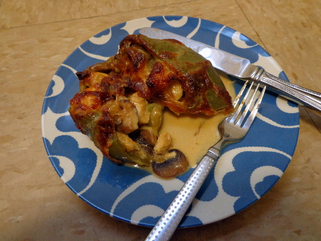 3. Place peppers cut side down on a microwave-safe plate and microwave for 4 minutes.  When they are cool enough to handle, place peppers cut side up in a casserole dish.